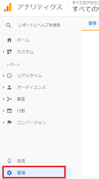 まずは、Google Analyticsにログインし、左側にあるメニューの中から「管理」を選択します。