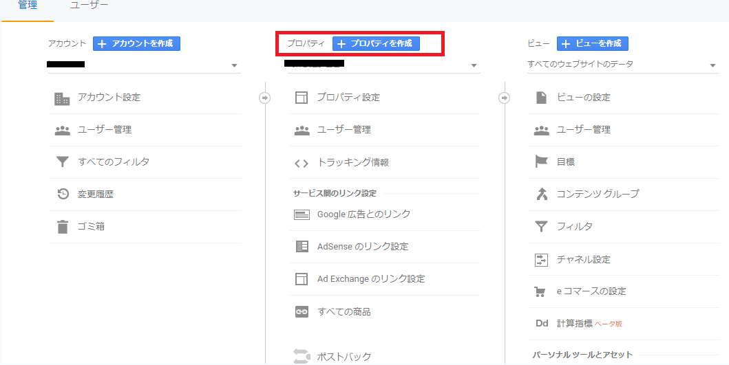 「管理タブ」を選択後、メイン画面の真ん中にある「プロパティ」から「プロパティを作成」を選択します。