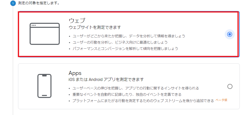 基本的にブログへのアクセス解析を行う場合には「ウェブ」を選択し、下部にある「続行」ボタンを押下します