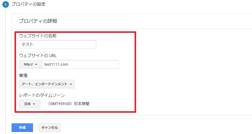 プロパティの詳細情報の設定画面に映るので、下記を入力し、「作成」ボタンを押下します。