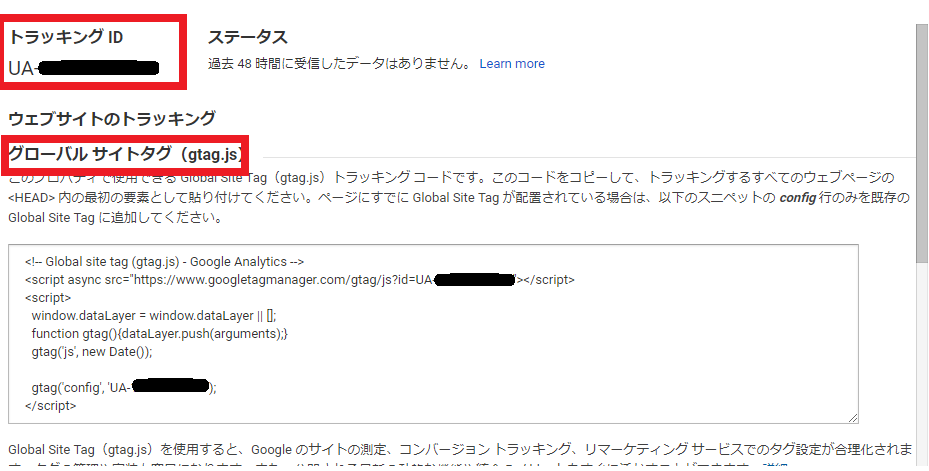 上記の「グローバルサイトタグ」と呼ばれるものをご自身が運用しているブログの<head></head>の間に記述する必要があります。