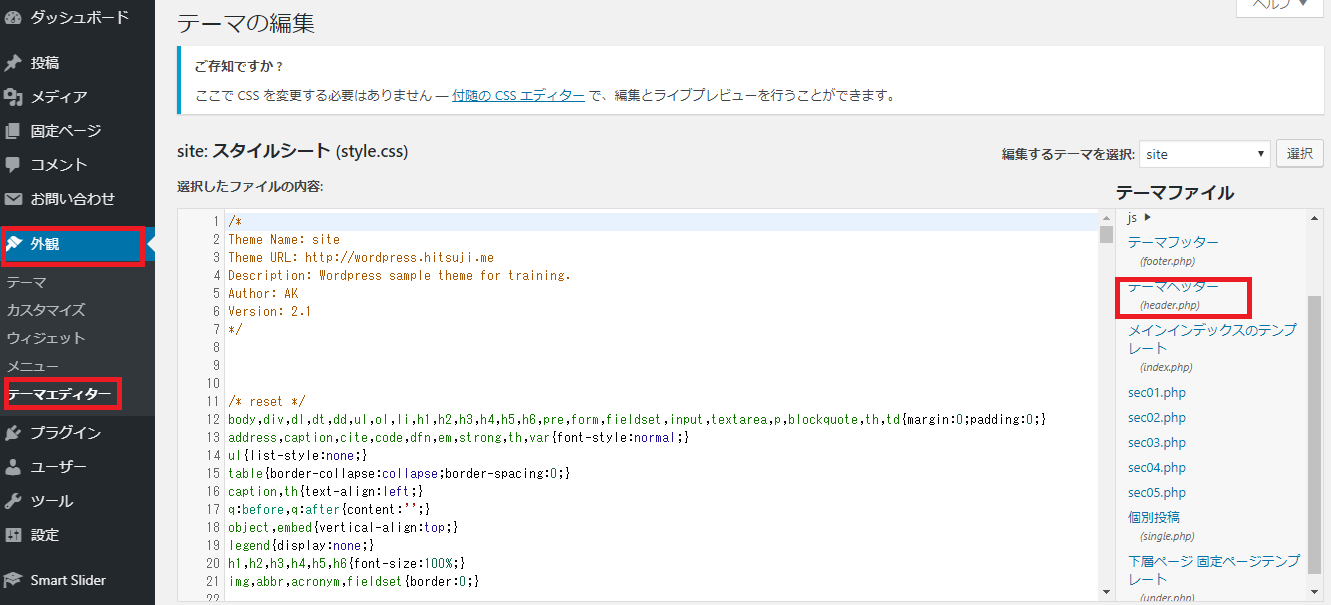 WordPressのダッシュボードから「外観」→「テーマエディタ」を選択する