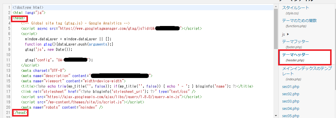 先ほどトラッキングIDを発行した際に出力された「グローバルサイトタグ」をコピペし、<head>の直後に追記します。