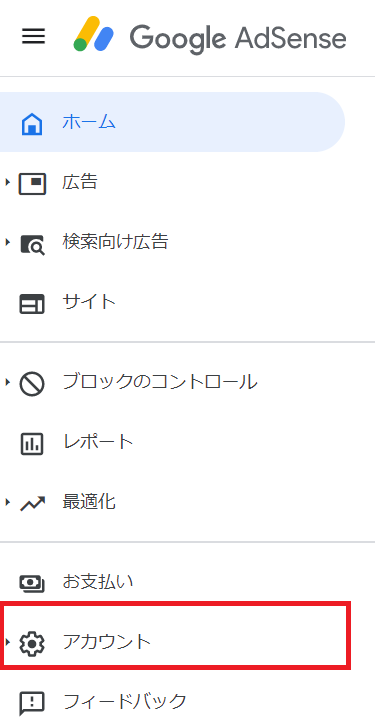 アドセンスにログインし「アカウント」を選択する