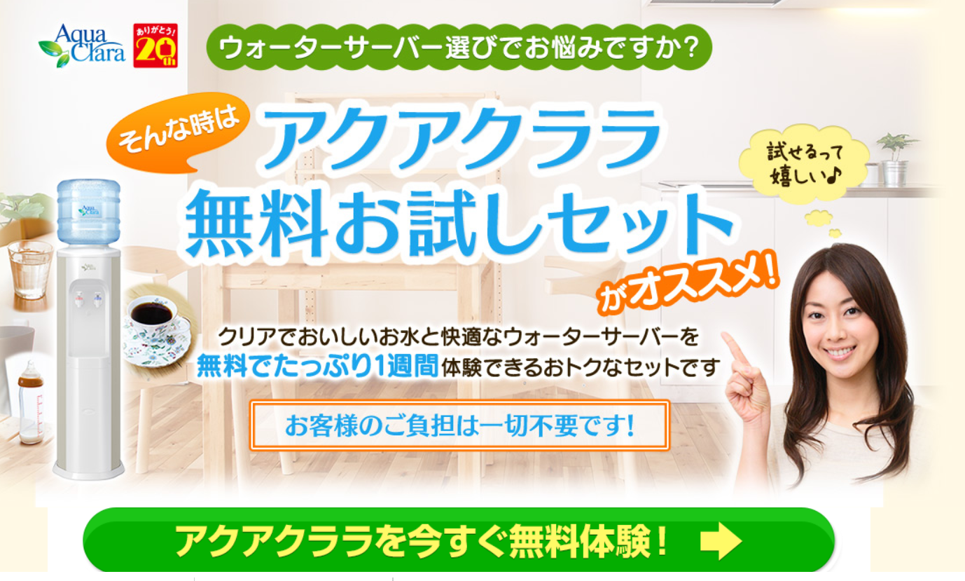 今回はウォーターサーバーの老舗ブランド「アクアクララ」の無料お試しセットを申し込みました。
