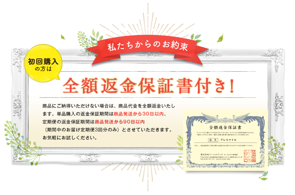 ちゃんと返信保証もあります。商品発送から30日以内、定期便の場合には商品発送から90日以内申請をすると、返金申請をすることができますので、気軽に試すことができます。