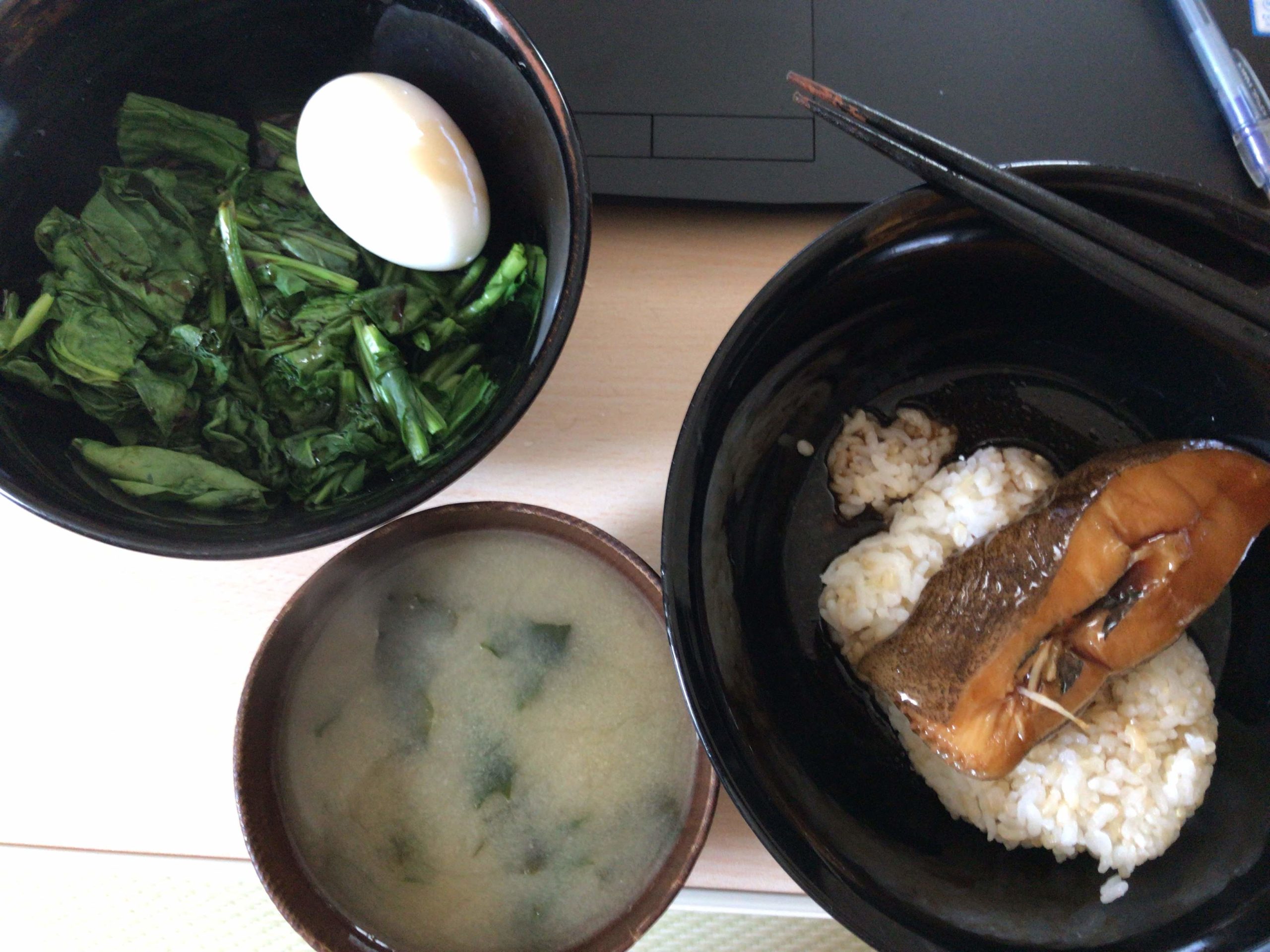 ゆで卵とほうれん草のセットは昼と同じです。(笑)