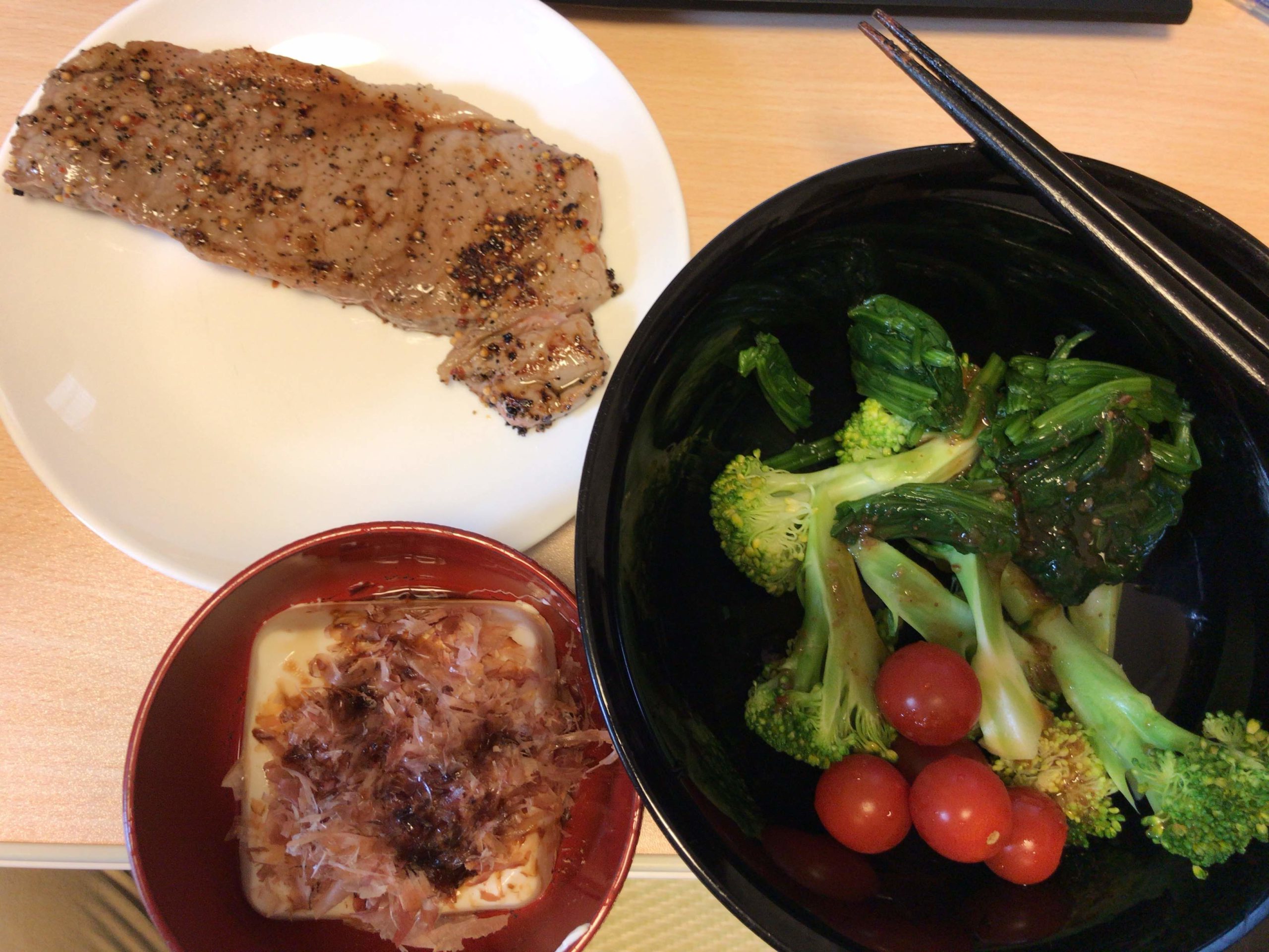 シンプルに塩コショウで味付けをすると意外にステーキソースをつけるよりもおいしく感じます。野菜は安定の緑野菜!最近はレタスやキュウリは購入しなくなり、ひたすらブロッコリーやオクラ・ホウレンソウなどが多いです。豆腐と鰹節は買いだめできるのでこちらも便利です。