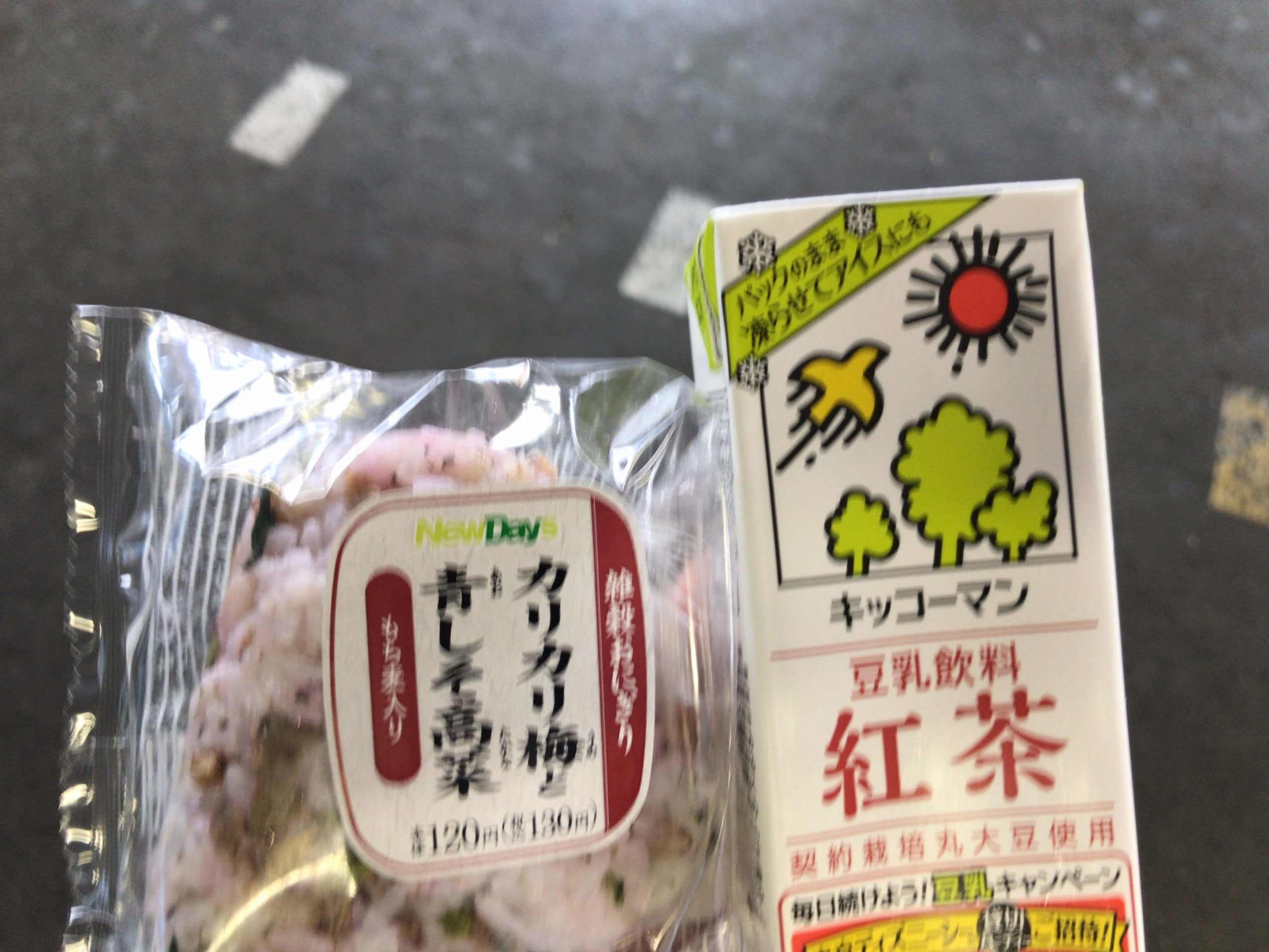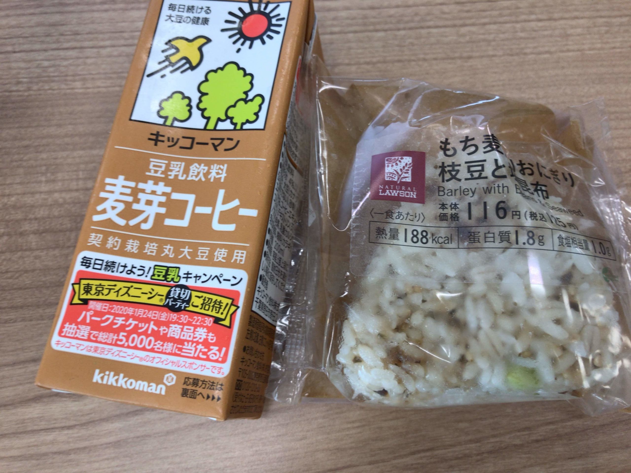 移動中のご飯だったため、糖質制限を最低限に考えて、雑穀おにぎりと豆乳にしました。