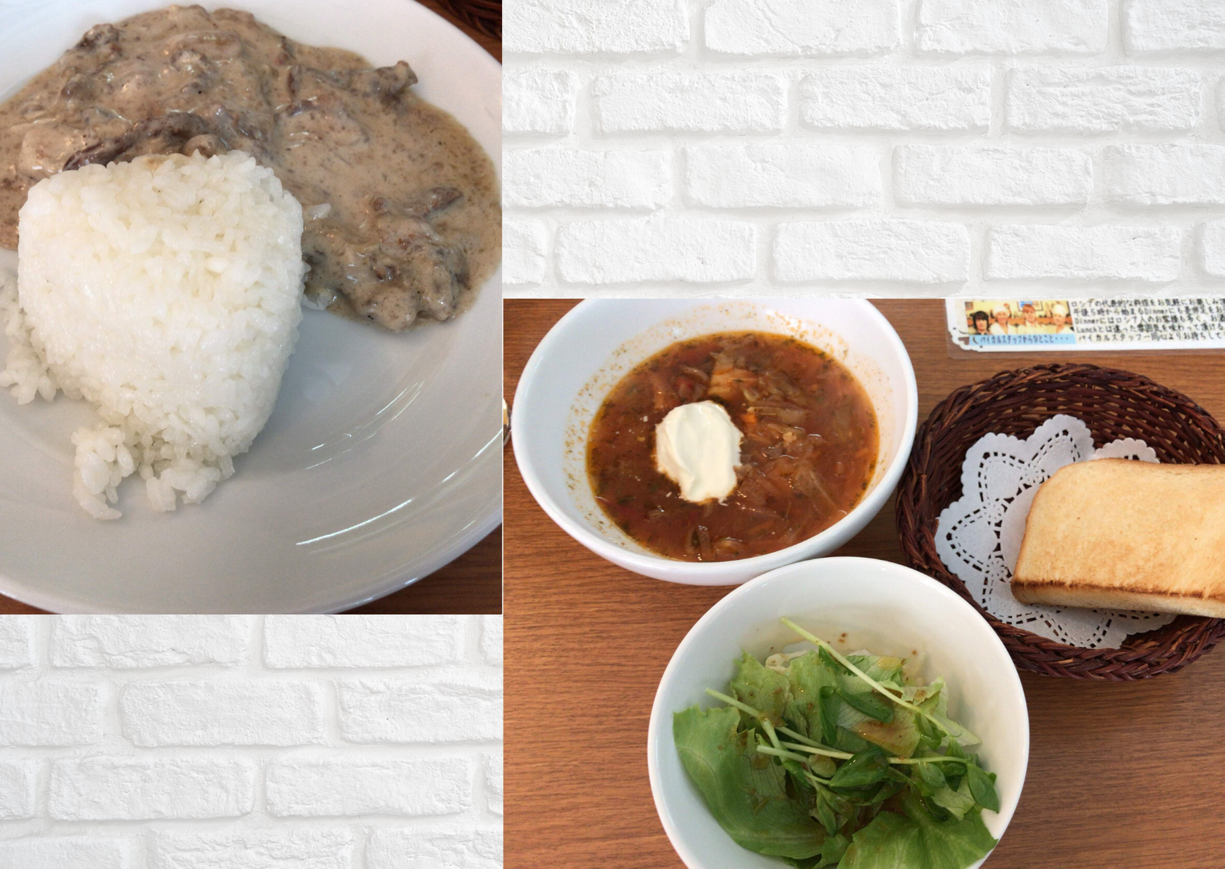 パンやライスがついていたので、糖質はあまり制限できていないです。「ボルシチ」野菜や肉がたっぷりの煮込んだスープでめちゃめちゃおいしかったです。上にのっている「サワークリーム」との相性も抜群です。