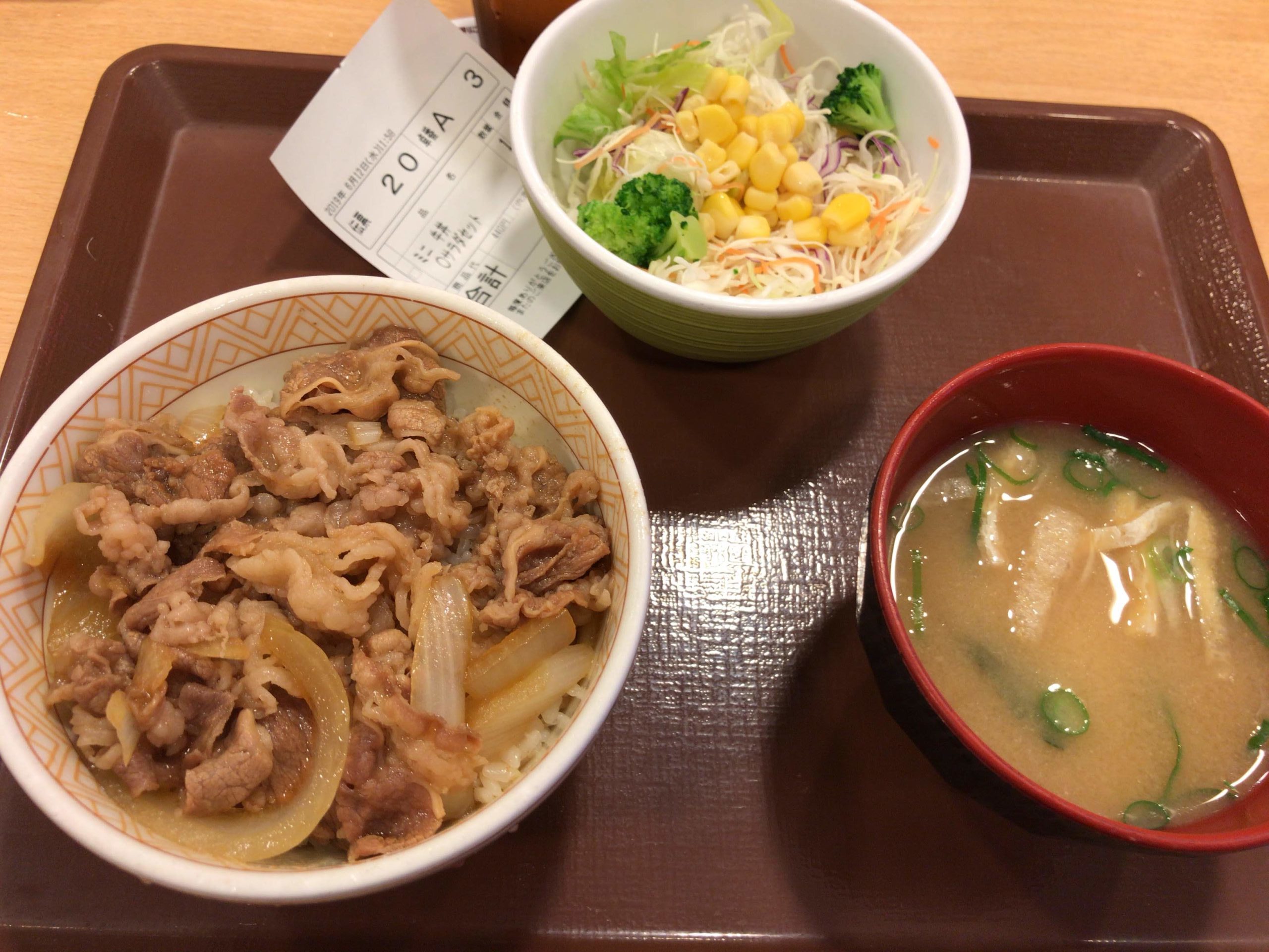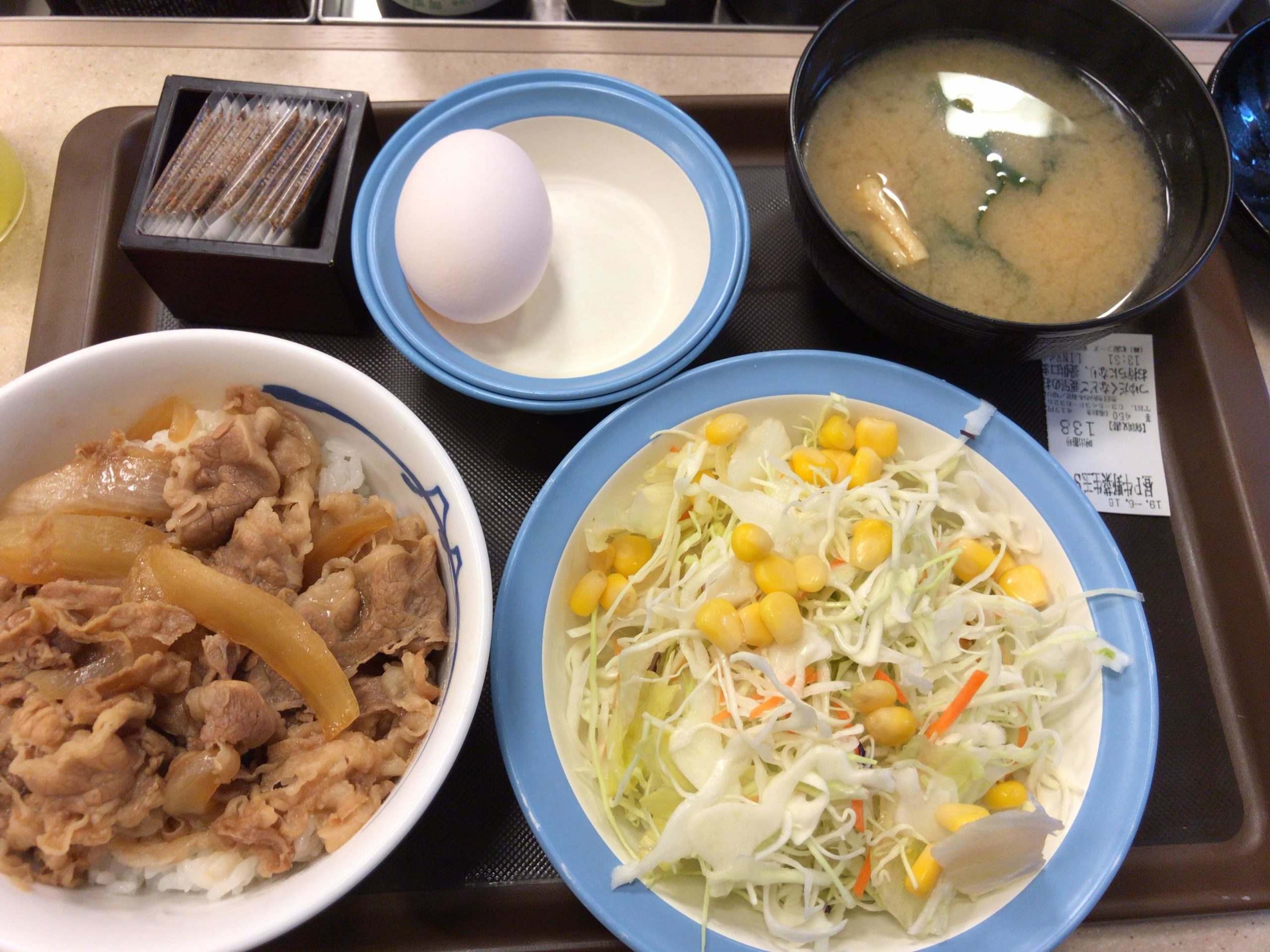 ひさしぶりのすき家です。ごはんへ先に箸が進みがちですが、まずは野菜を食べるようにしましょう。「ベジファースト」の効果ですね。