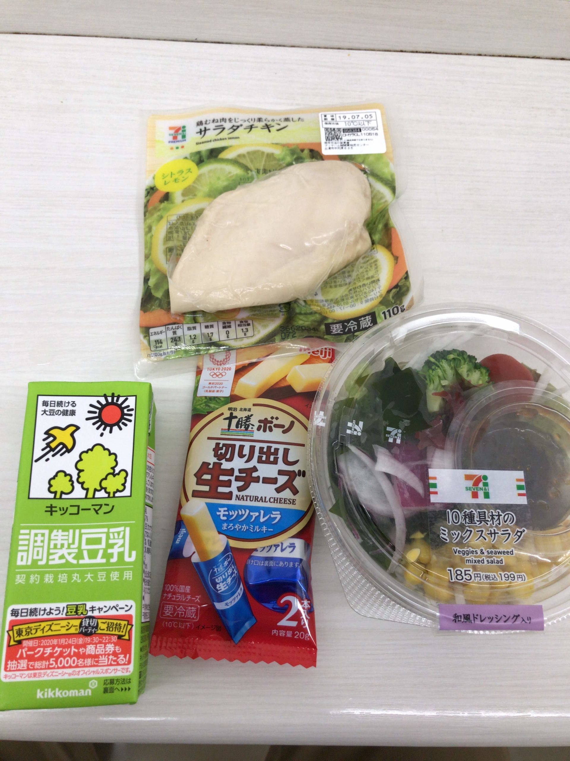 チーズとサラダチキンと野菜サラダ、糖質オフ鉄板メニューですね。味や種類を変えると味に変化が出ていい感じです。