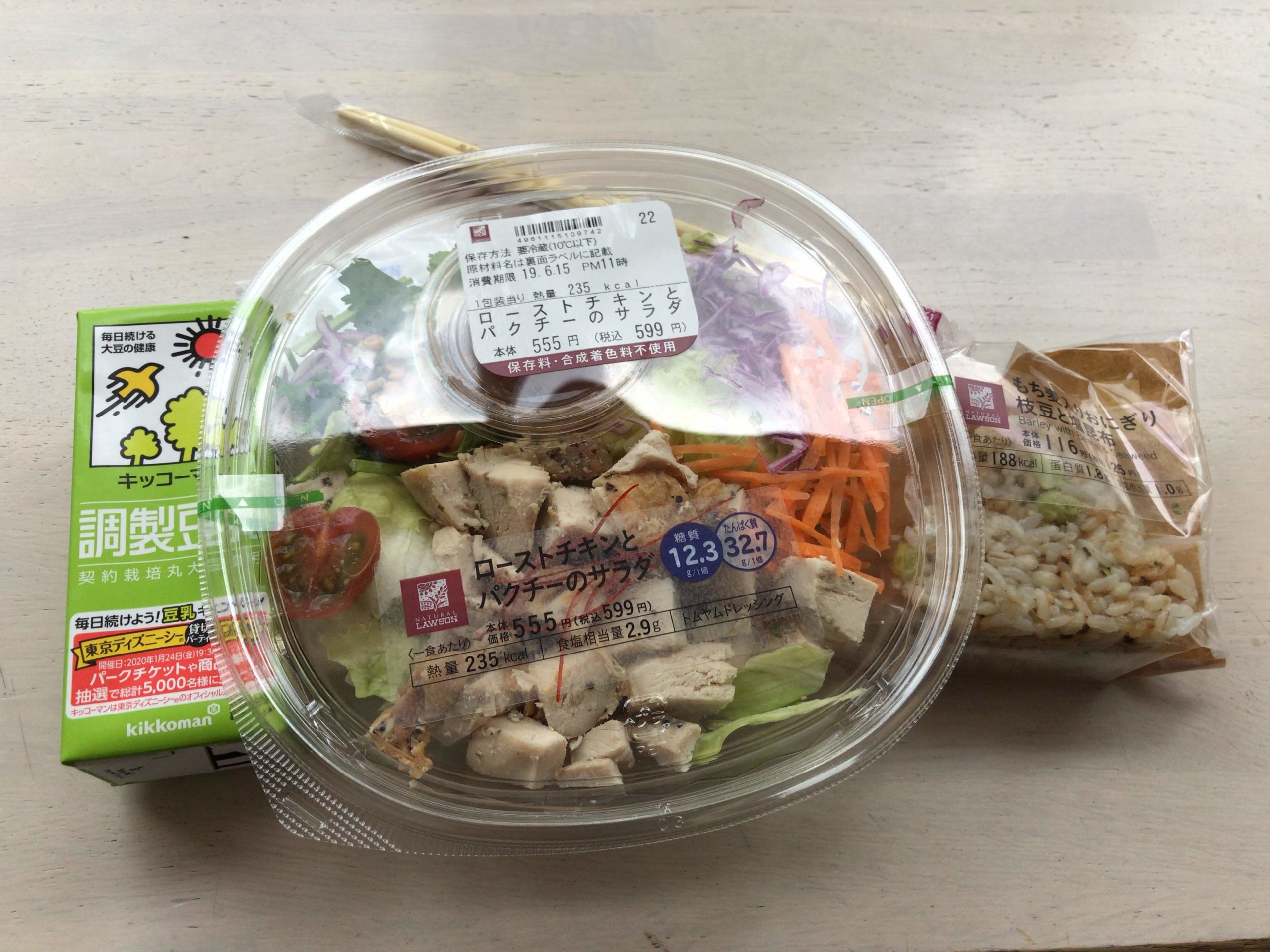 コンビニの中でもローソンは特に、糖質制限している人にはやさしいメニューが多いです。今回は、ローストチキンとパクチーのサラダを食べましたが、かなりボリュームが多く、おにぎりはいらなかったかなと反省です。