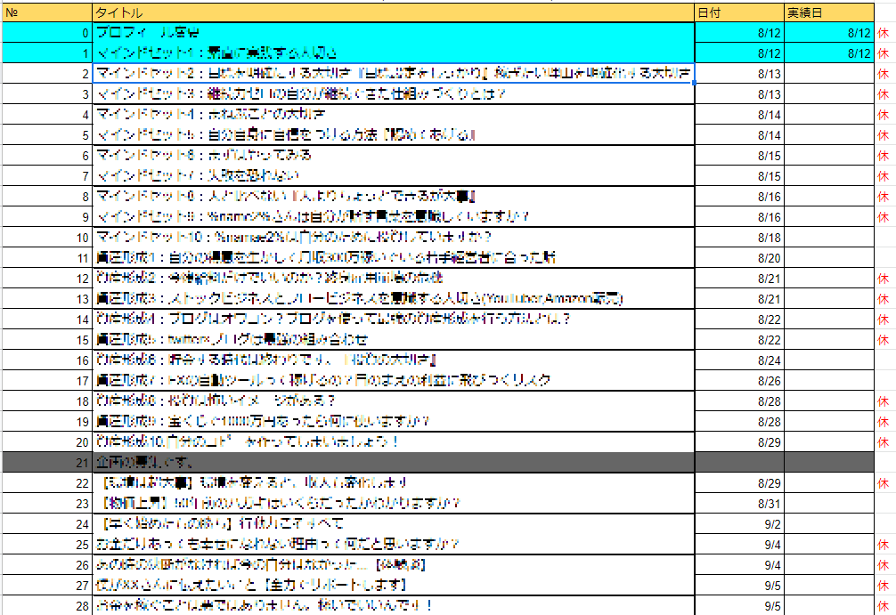 作業内容を書いて横に「日付」と「実績日」を記入します。そして完了したら「青色」で塗りつぶしていきます。