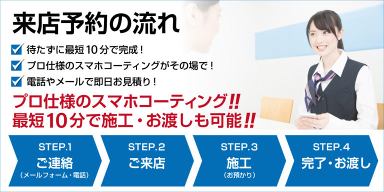 HPからお好きな時間を予約をすることで待たずに最短10分でコーティングが完了します。予約店舗も全国から指定することができます。詳細はホームページよりご確認ください。