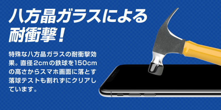 G-PACKで掲載される八方晶ガラスは独自の技術により、靭性が高く、耐衝撃の機能に優れているガラス被膜となっています。そのため直径2cmの鉄球を150cmの高さから落とす性能試験も割れずにクリアしています。