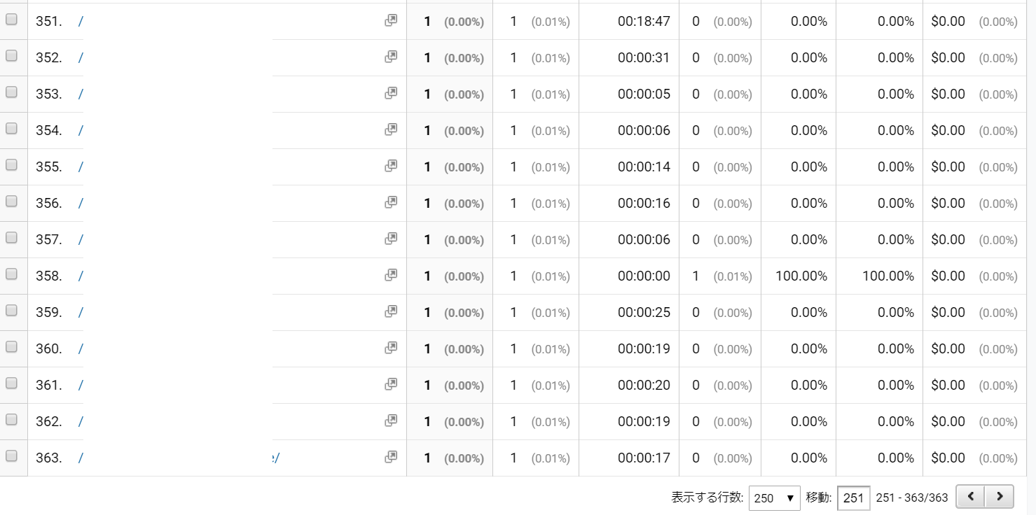ということでゴミ記事が出てきました。これらは月間PV数が1の記事たちです。