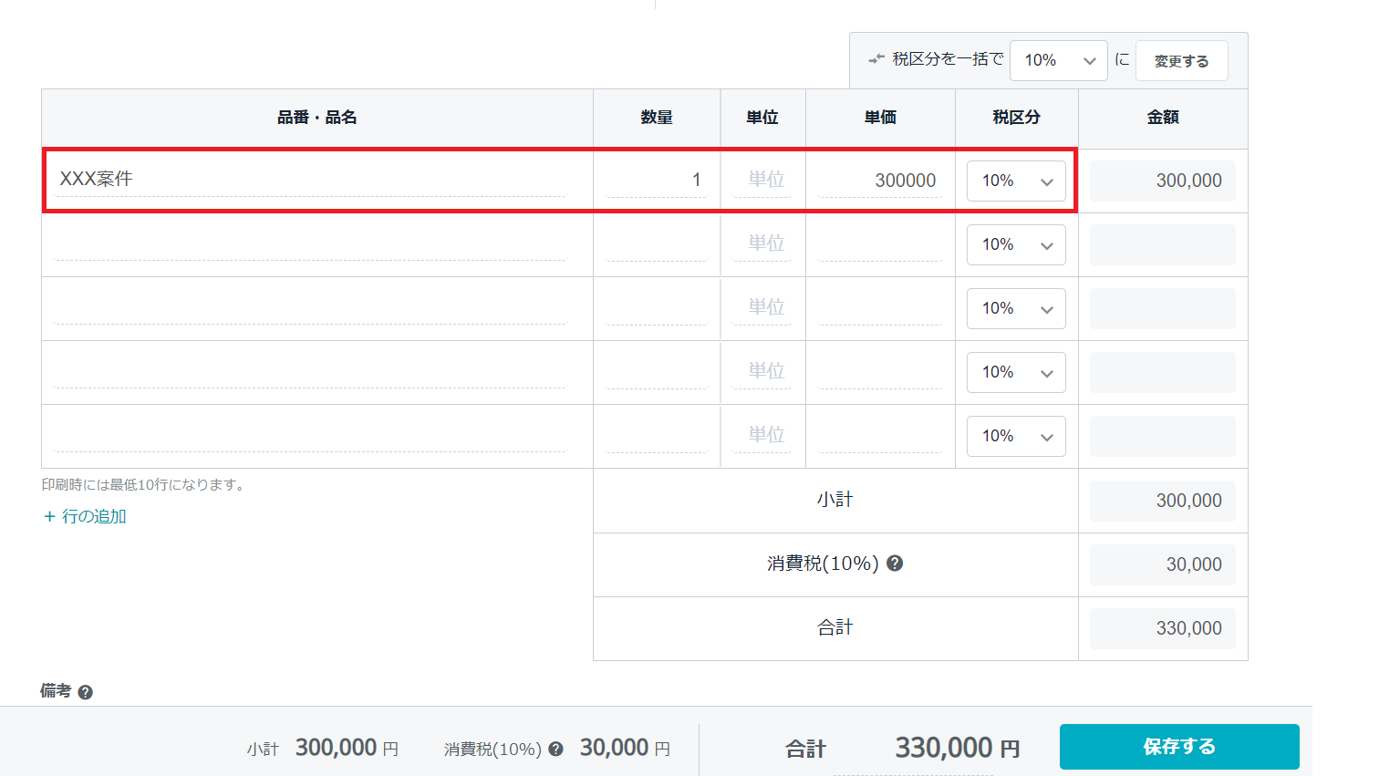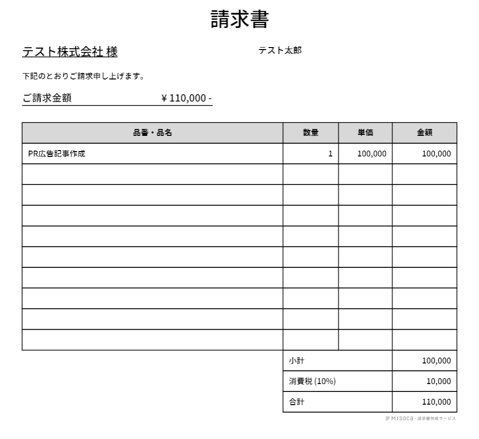 ここまでの手順を行うと自動で以下のような請求書が作成されます。入力項目は少ないのですぐに作成できます。