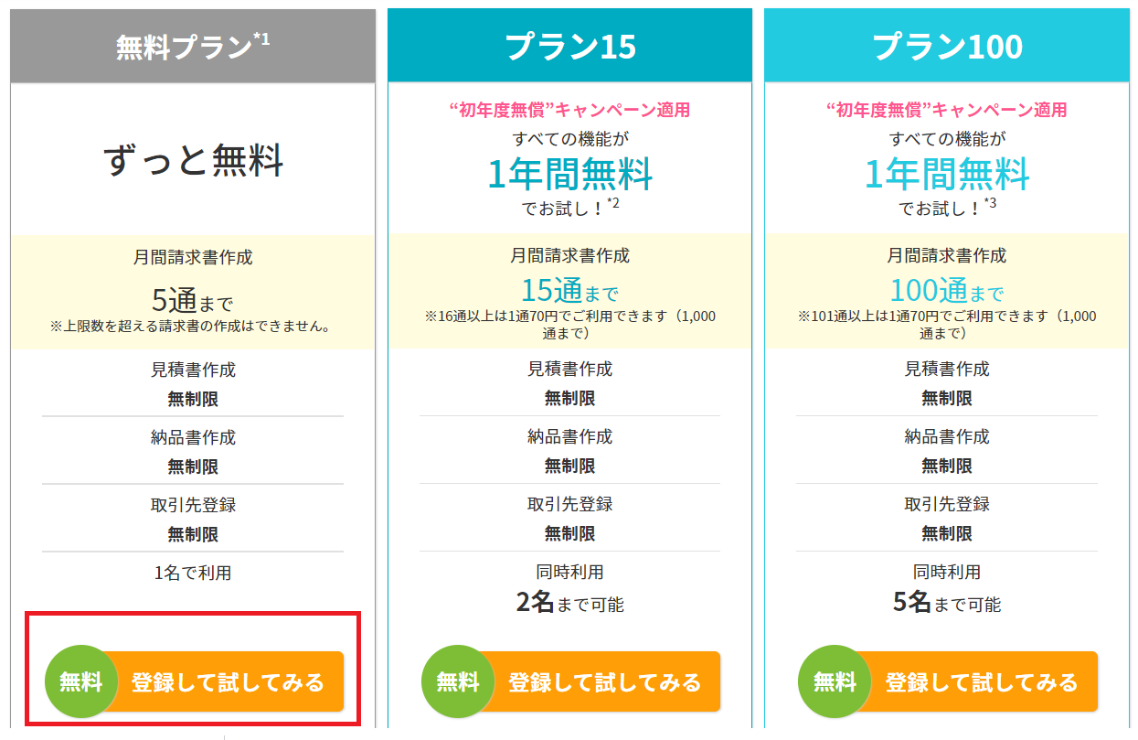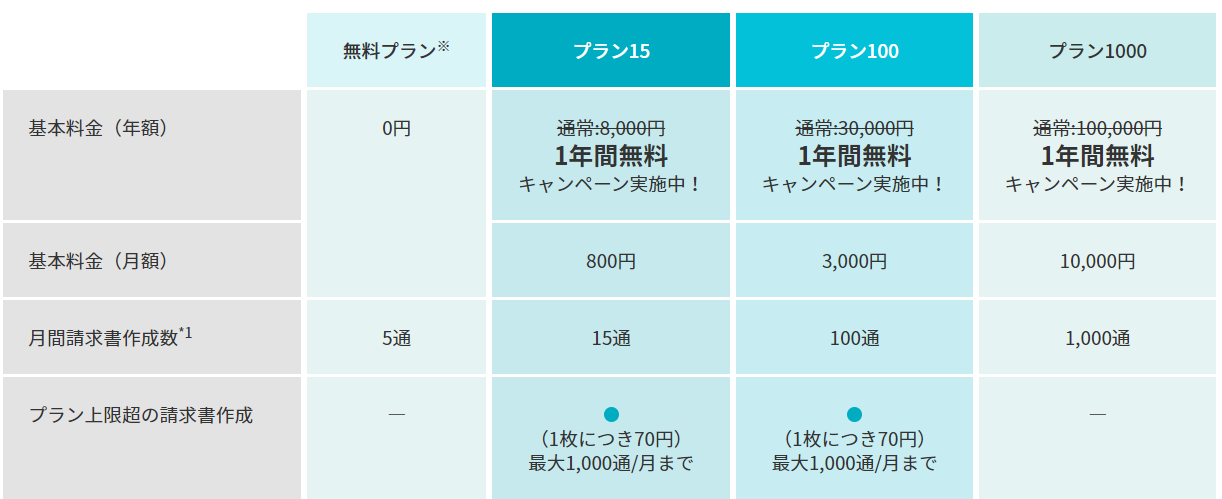請求書の上限が月5通までしか使わない場合には無料プランでも十分なのですが 、プランによっては最大1000通まで選べるため、法人であっても十分な上限数です。