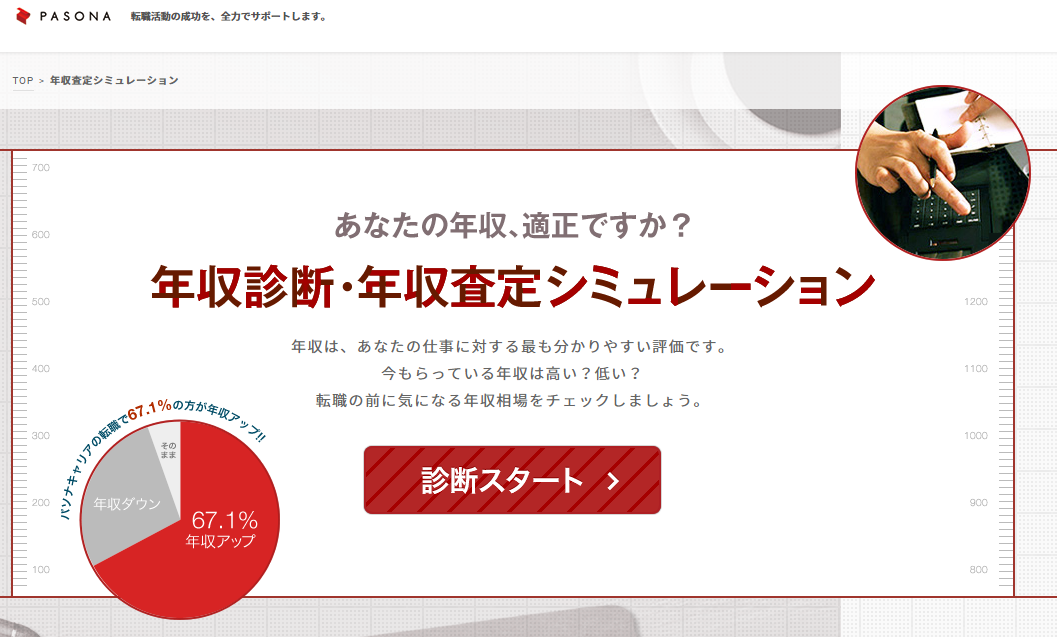 パソナキャリアの年収シミュレーションがわかりやすいので、使ってみましょう。