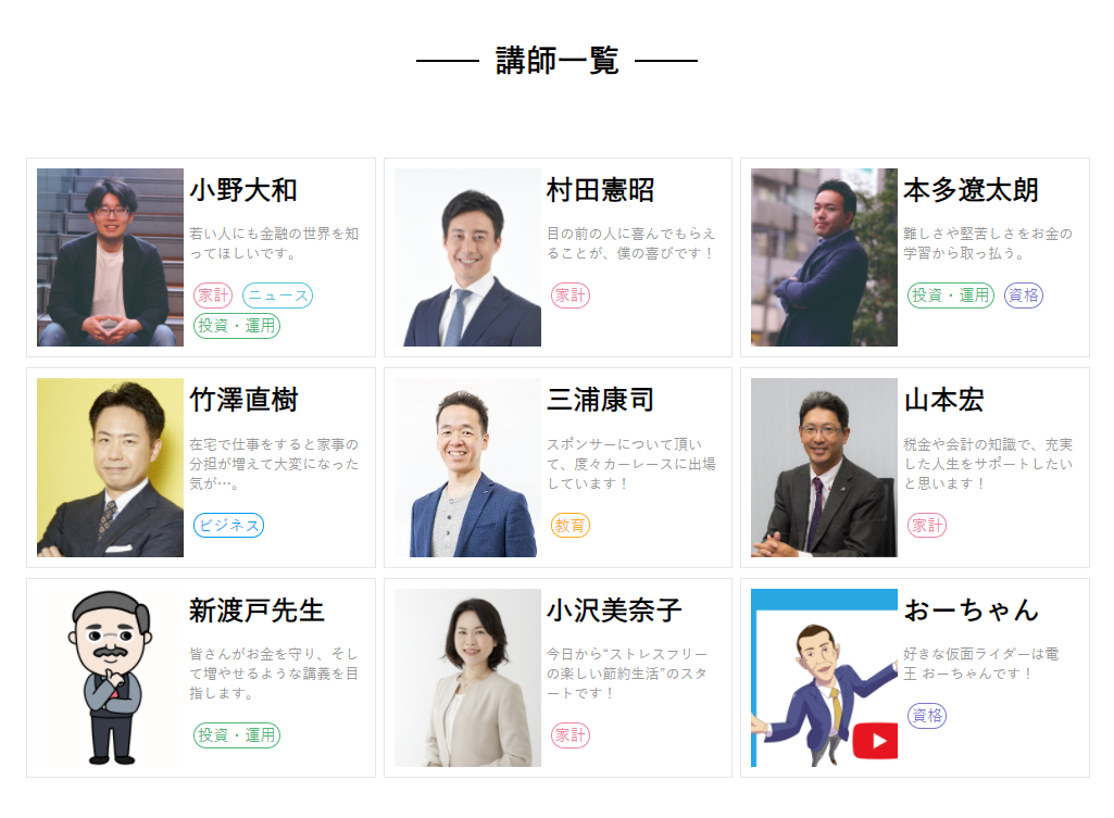 実際に本を出版されている方、YouTuberの方などかなり実績のある講師が多く、講師の方の肩書を見てみてると、どの方も実際に投資の経験している方ばかりなので信頼できます。そしてカネスタ代表と出演者の一部の方はFP1級を取得しておりFP業務に詳しいということが強みです。