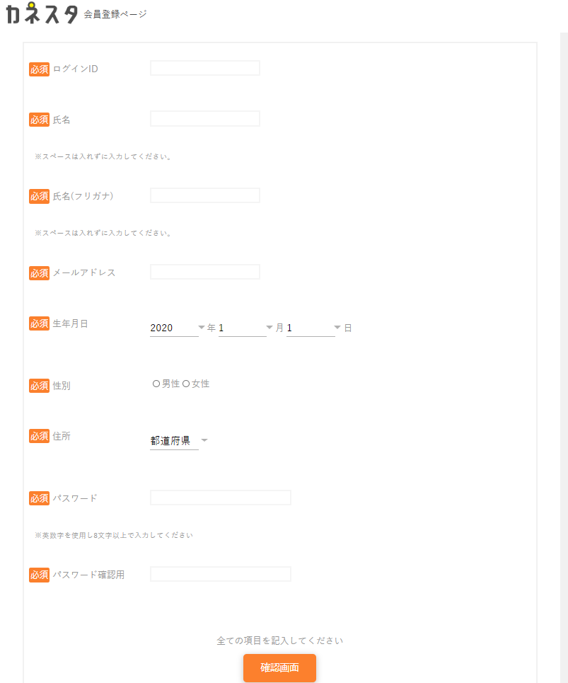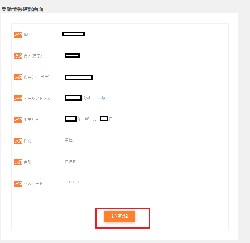 | ・ログインID:好きなものを設定 ・氏名 ・氏名(フリガナ) ・メールアドレス ・生年月日 ・性別 ・住所:都道府県のみ ・パスワード ・パスワード確認用 |