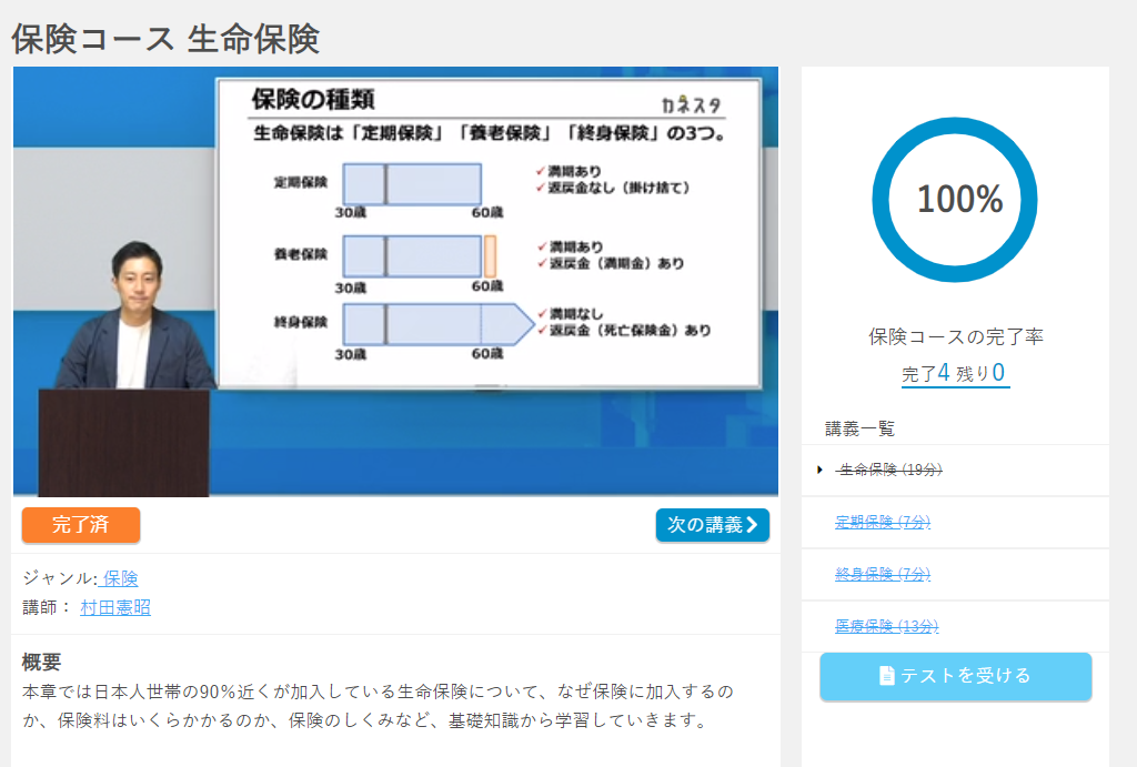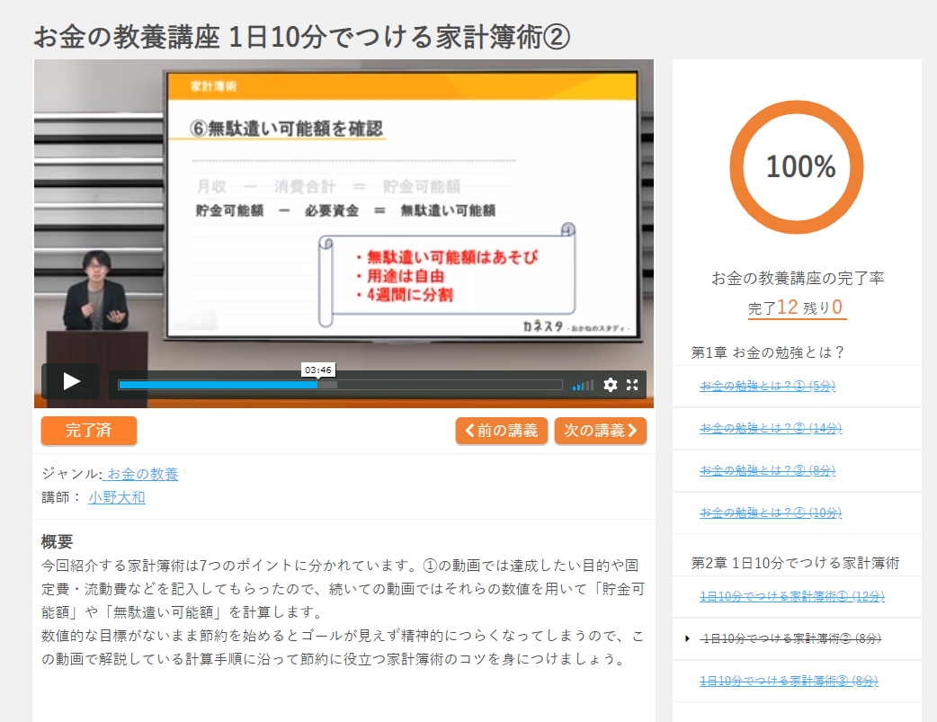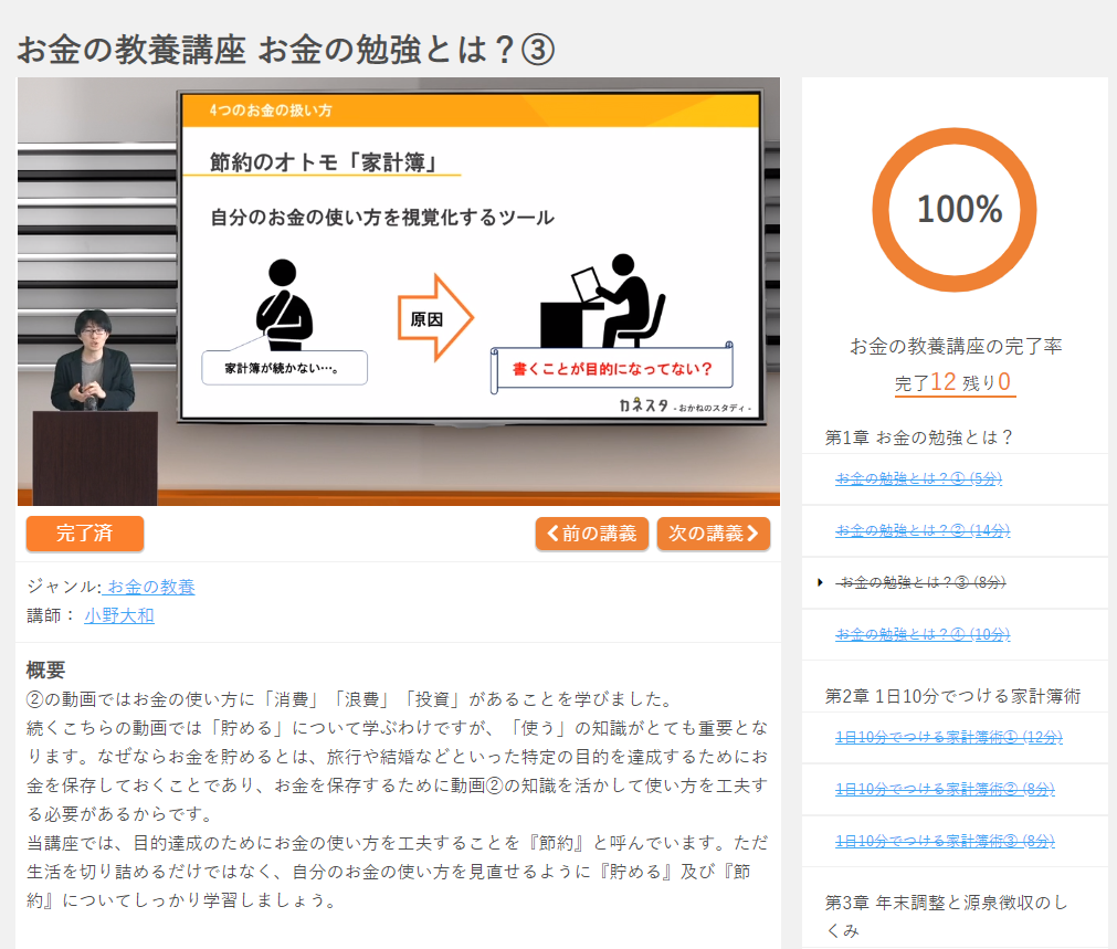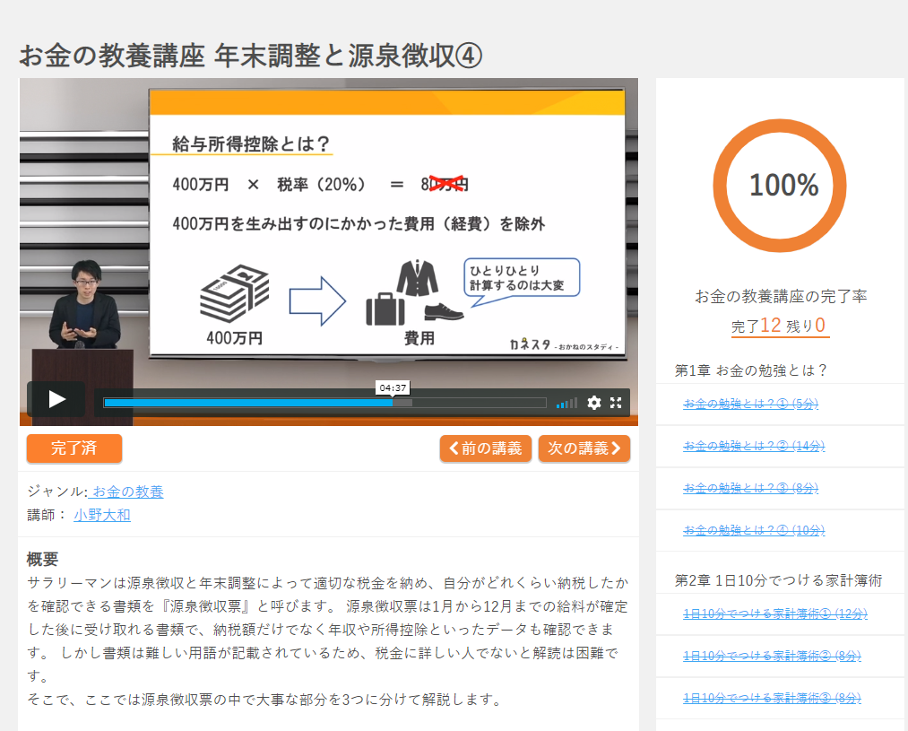 ・生命保険 (19分) お金の教養コース(95分) 第1章 お金の勉強とは? 第2章 1日10分でつける家計簿術 第3章 年末調整と源泉徴収のしくみ
