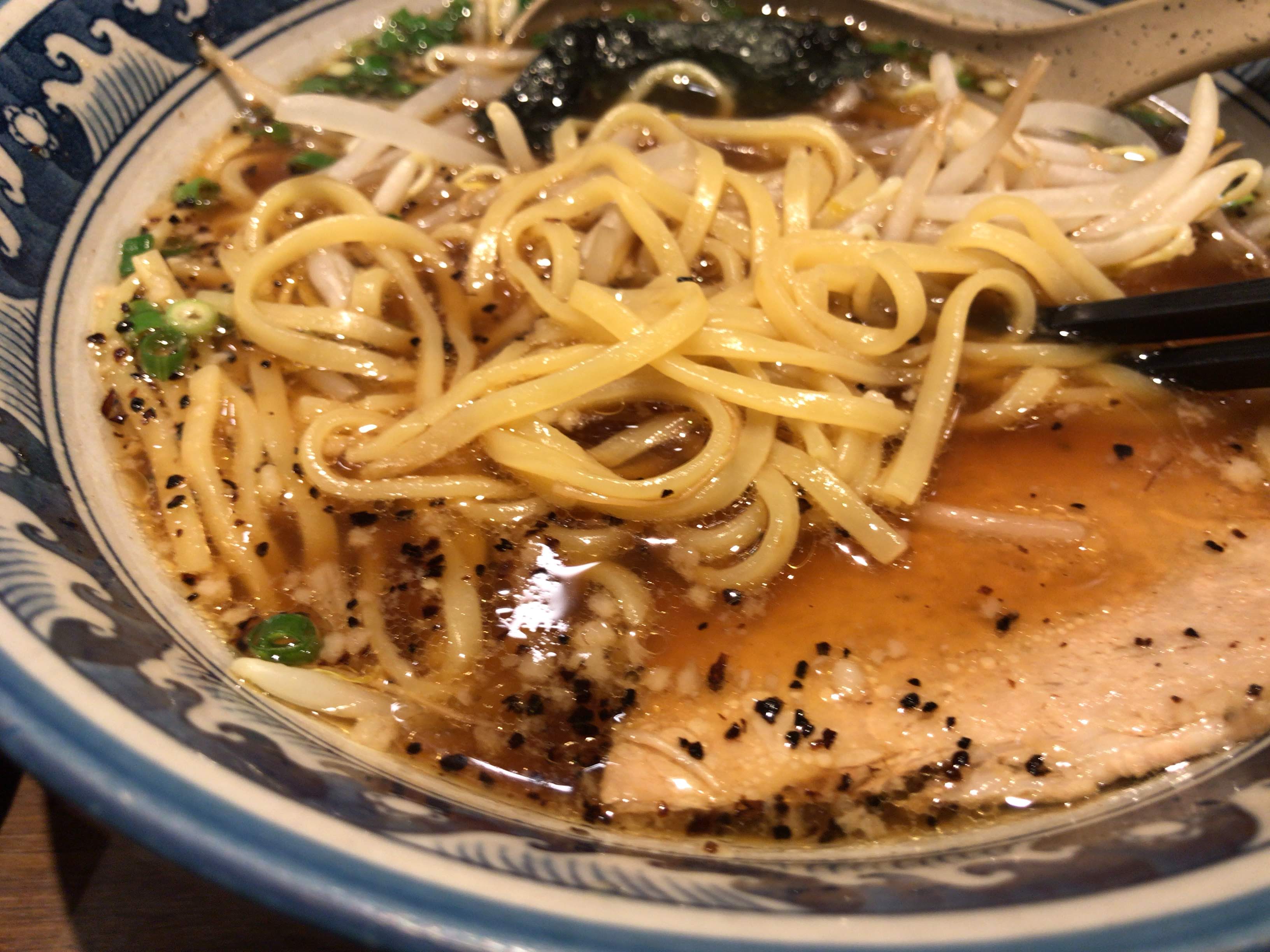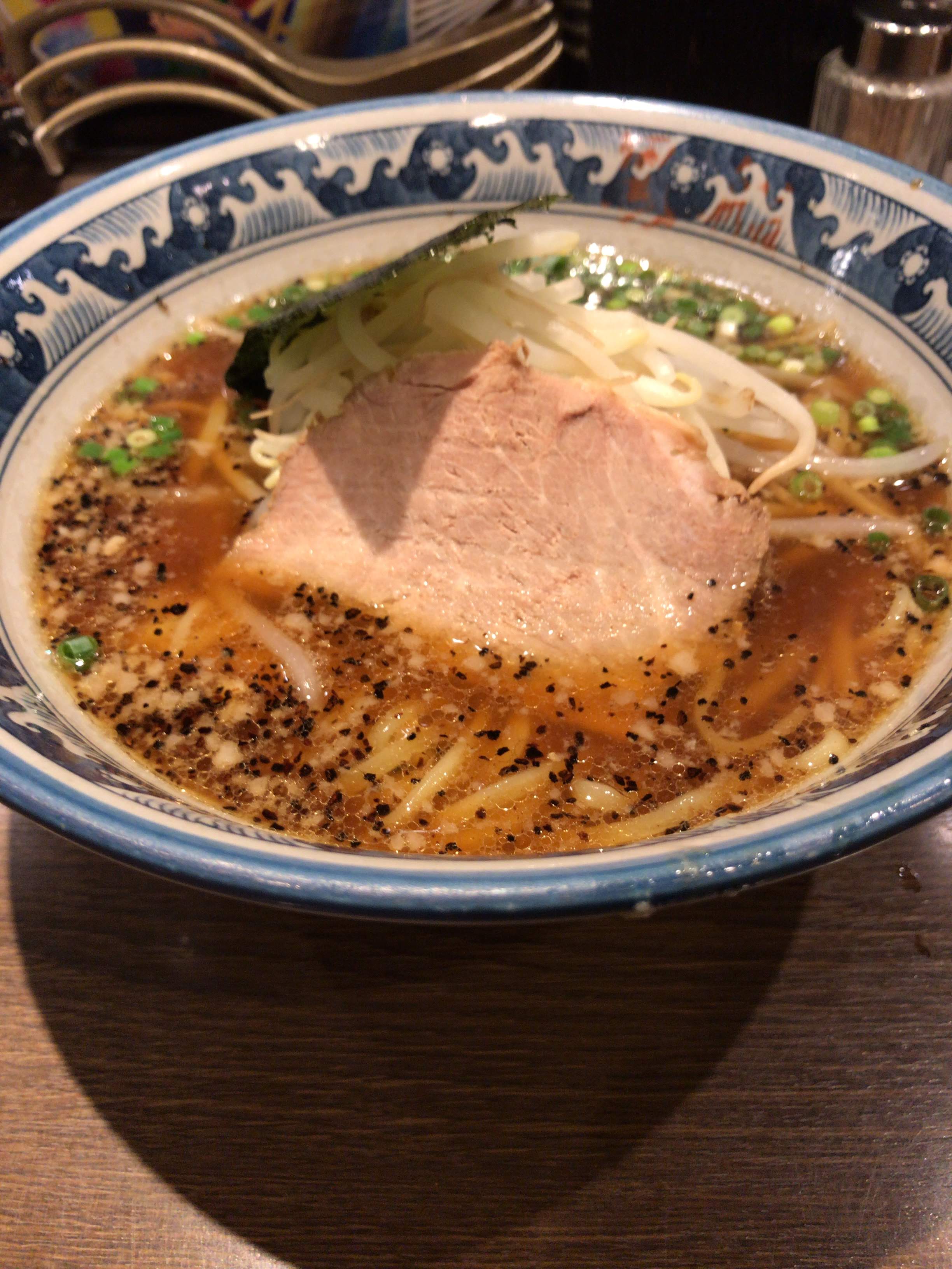 スープに黒コショウが振りかけられているのが特徴的で、あとはチャーシューが1枚ともやし・ネギ・背油ベースの醤油スープという比較的シンプルなラーメンです。麺は中太の平打ち麺でした。