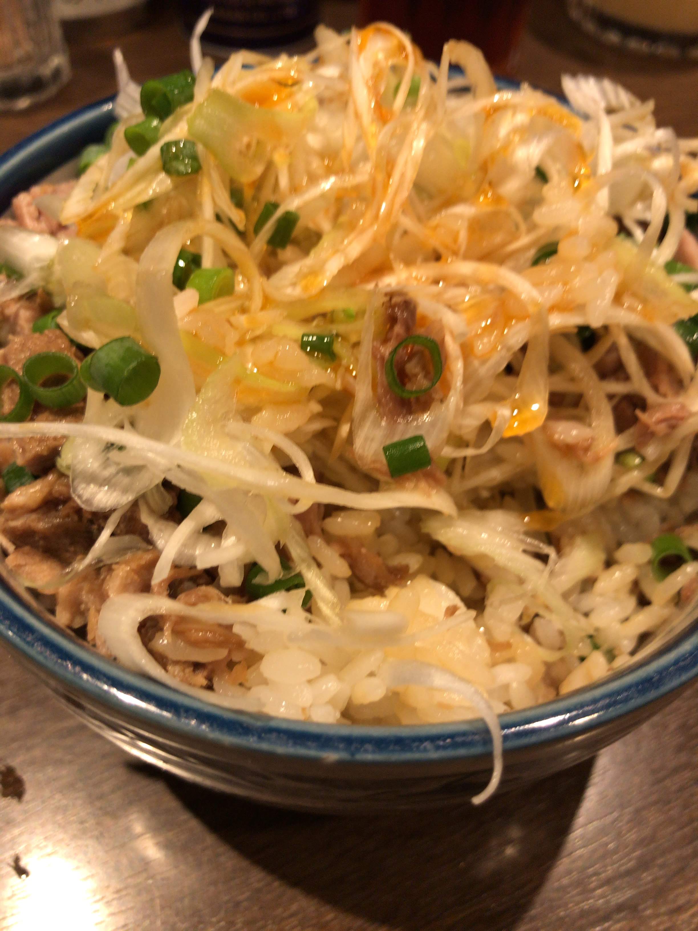 少し食べると、店員さんのアドバイス通りラー油を垂らしてみるとこれもなかなかイケます。辛みがつきメリハリが出るので、途中から入れるのがおすすめです。ネギ・チャーシュー・ご飯のバランスもいい感じで、おいしかったです。ただ、390円はちょっと高いかな。。せめて300円ぐらいにしてほしいところ。