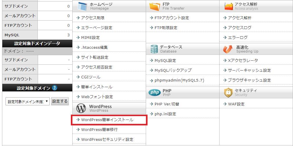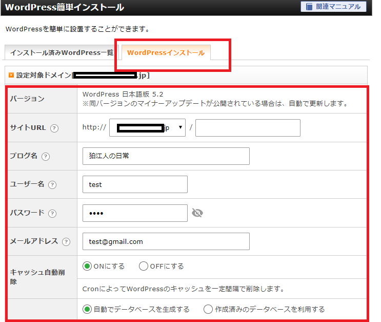 右側にある「WordPressインストール」タブを選択し、設定対象ドメインの情報を入力します。