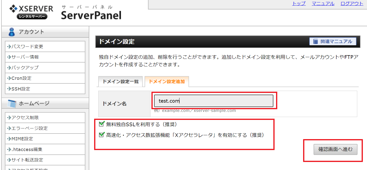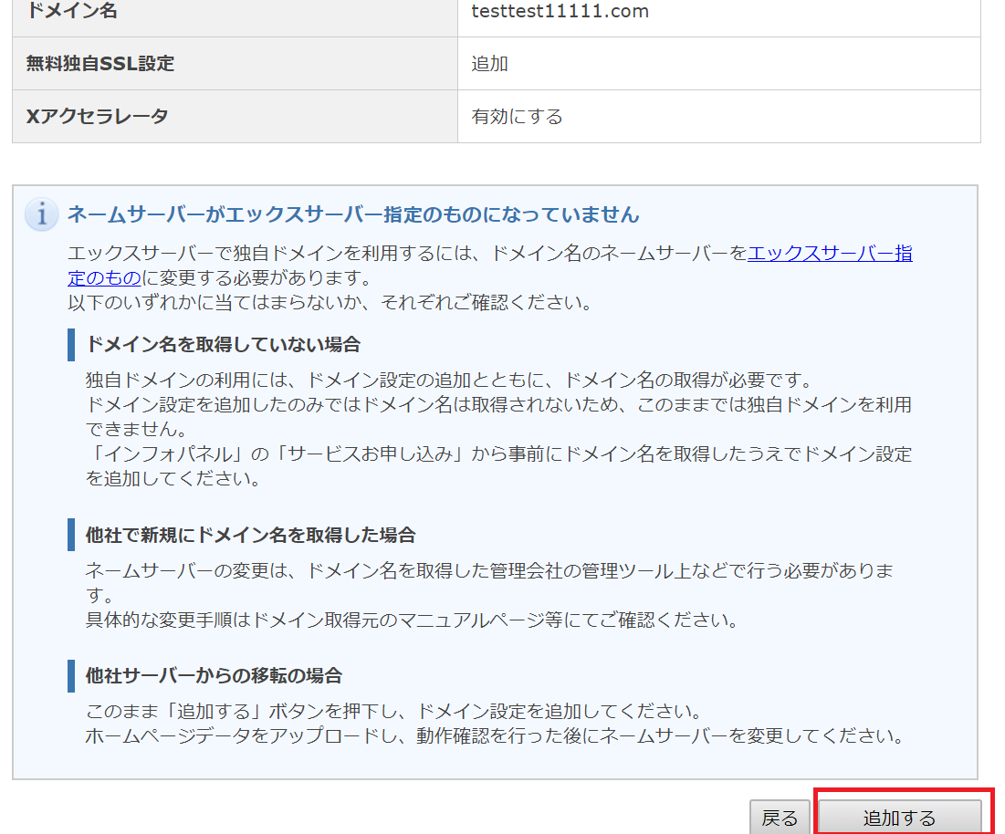 ※「無料独自SSLを利用する」と「高速化・アクセス数拡張機能「Xアクセラレータ」を有効にする(推奨)」はチェックをしたままでOKです。