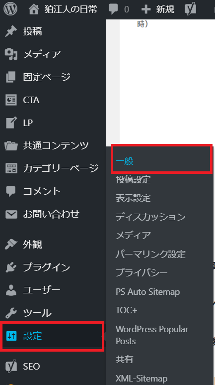 右のメニューの「設定」から「一般」を選択しクリックします。