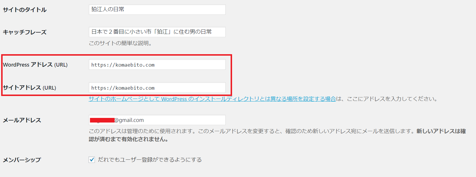 前回独自SSL化を行ったと思いますので、URLは、httpsから始まるアドレスに変更を行います。