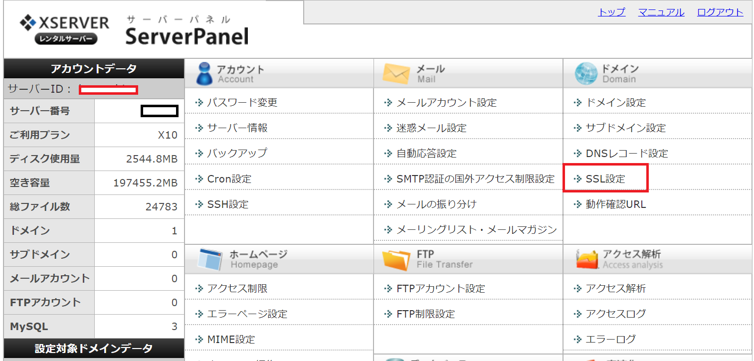 サーバーパネルから「ドメイン」からSSL設定を選択する
