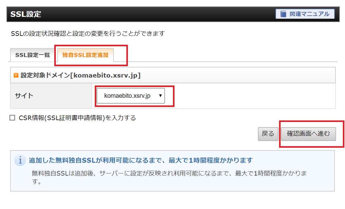 「独自SSL設定追加」のタブを選択し、サイトドメインを選択し、「確認画面へ進む」を押下します。