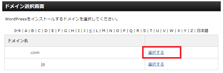 「ドメイン選択画面」からWordPressをインストールしたいドメインにたいして「選択する」をクリックします。