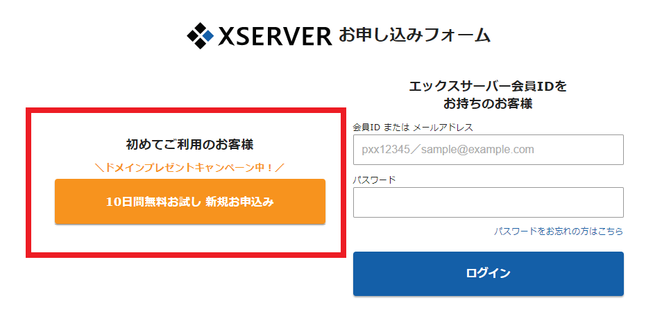 エックスサーバーのトップページから「申し込みはこちら」を選択