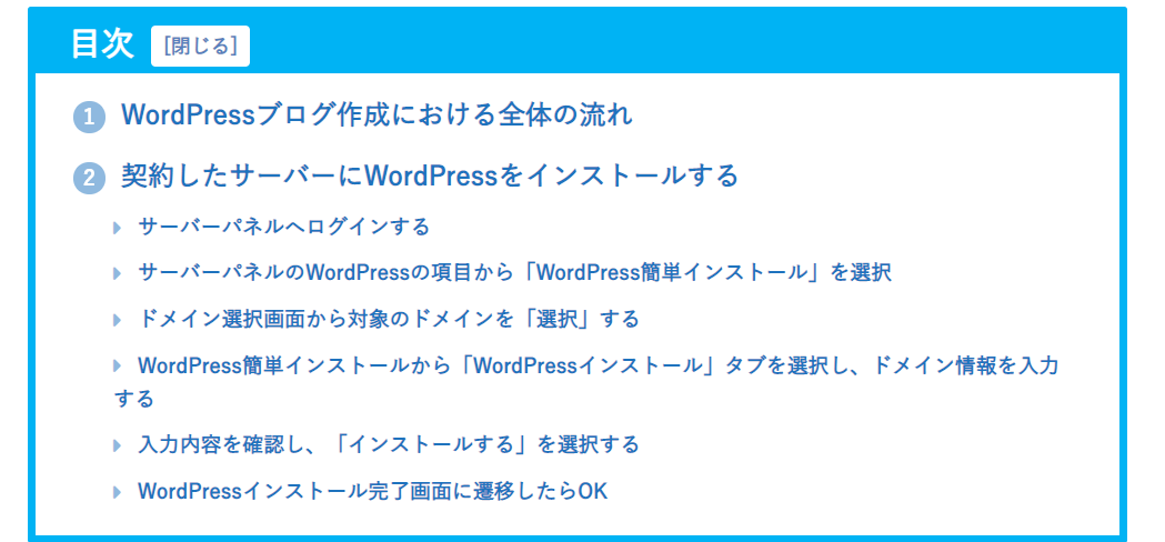ブログを読んでいる人はすべてを読むほど暇人ではないのです。そのため、ブログの冒頭に「この記事にはこういう項目の内容がありますよ」という目次を設定する必要があります。