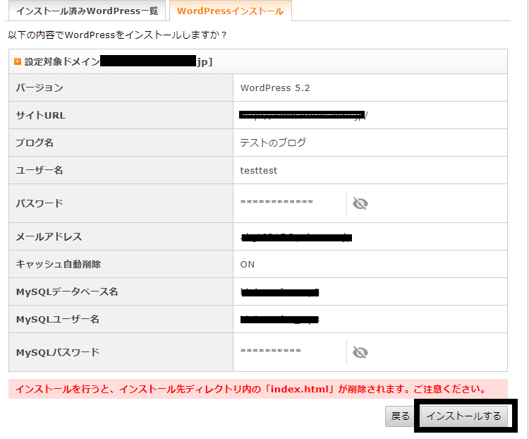 入力内容を確認し、問題なければ右下にある「インストールする」ボタンを押下する。