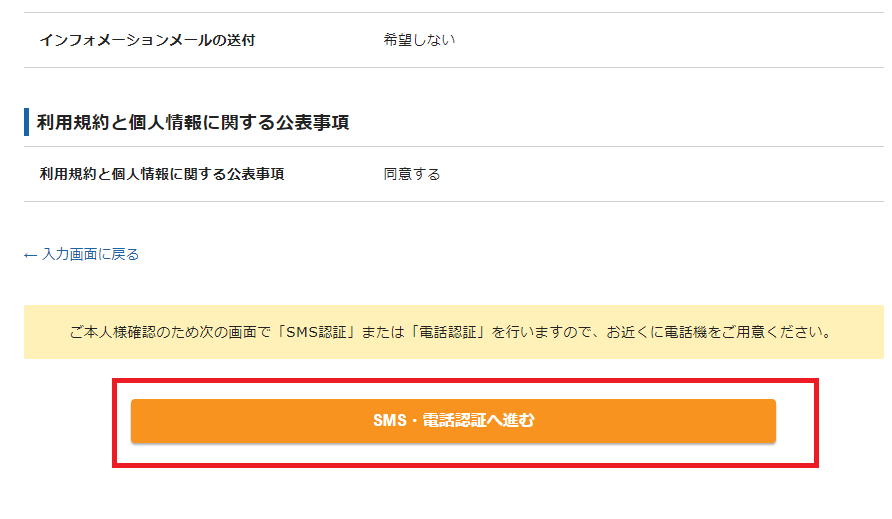 入力内容確認画面で内容を確認し、「SMS・電話認証」を押下する
