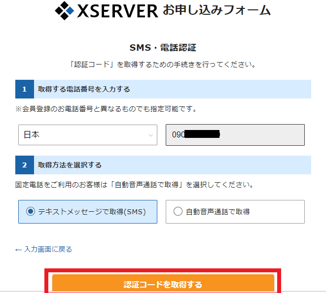 「SMS・電話認証」画面で、「認証コードを取得する」を選択する
