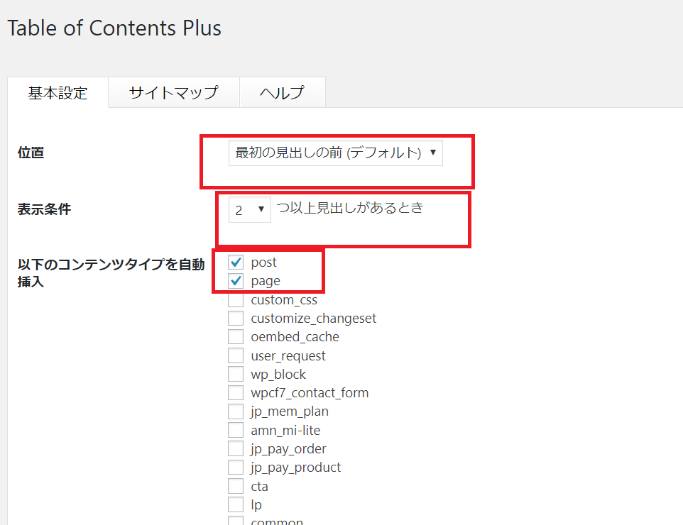 以下のコンテンツタイプを自動挿入:postとpageにチェック