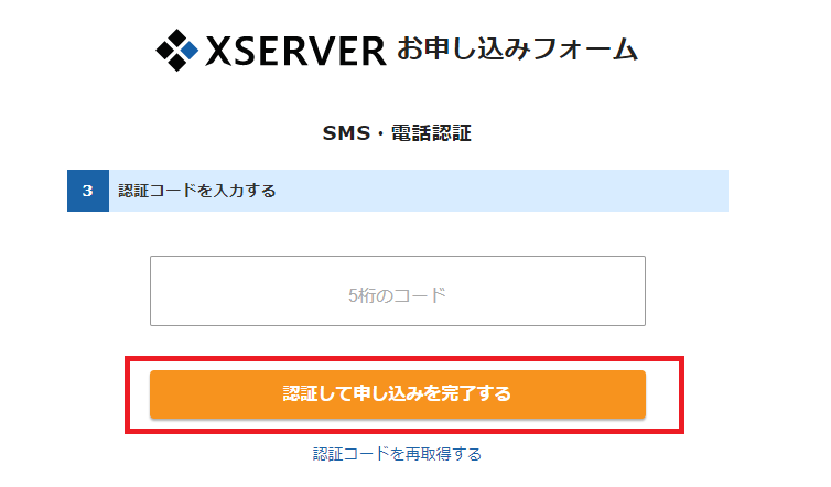 「SMS・電話認証」画面で、SMSメールで送られてきた認証コードを入力し、「認証して申し込みを完了する」を選択する