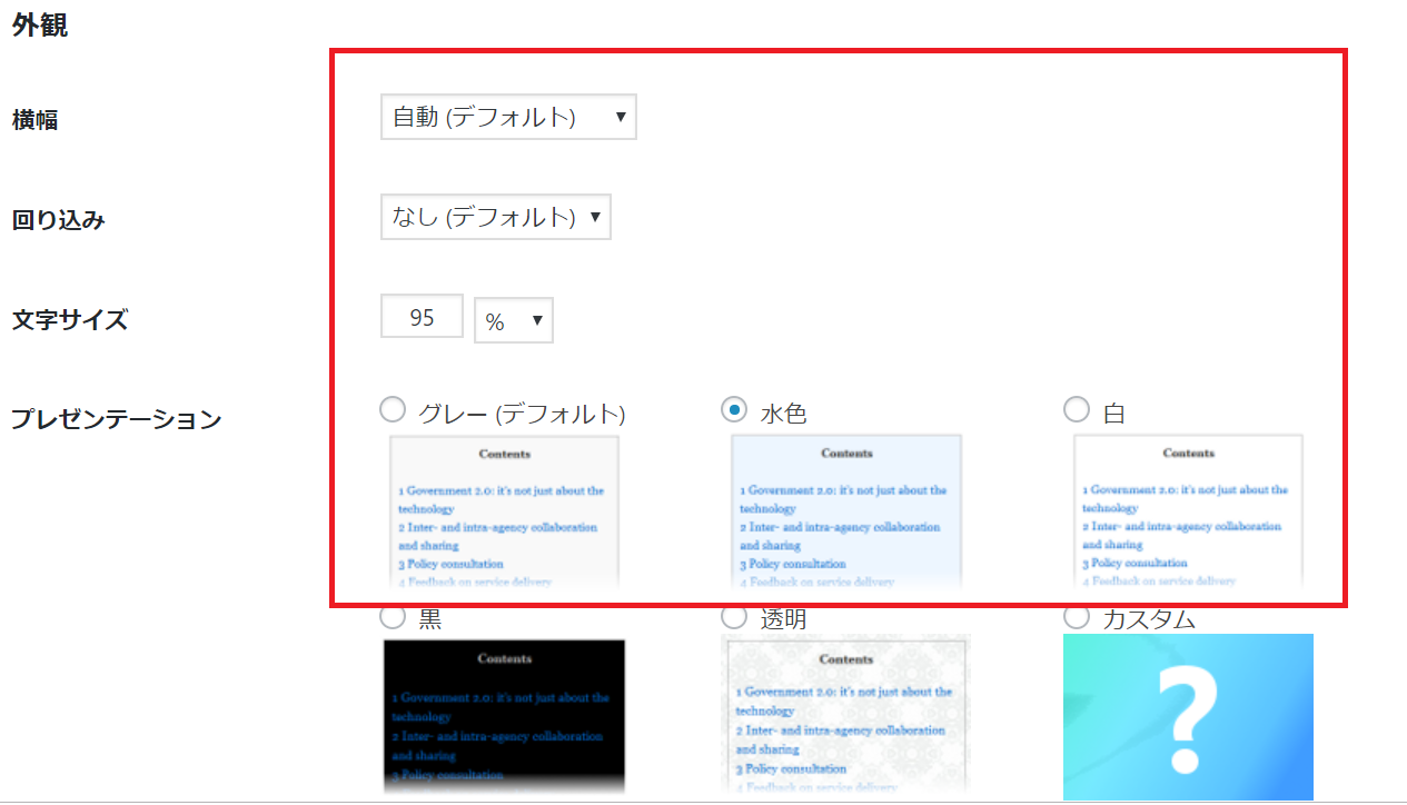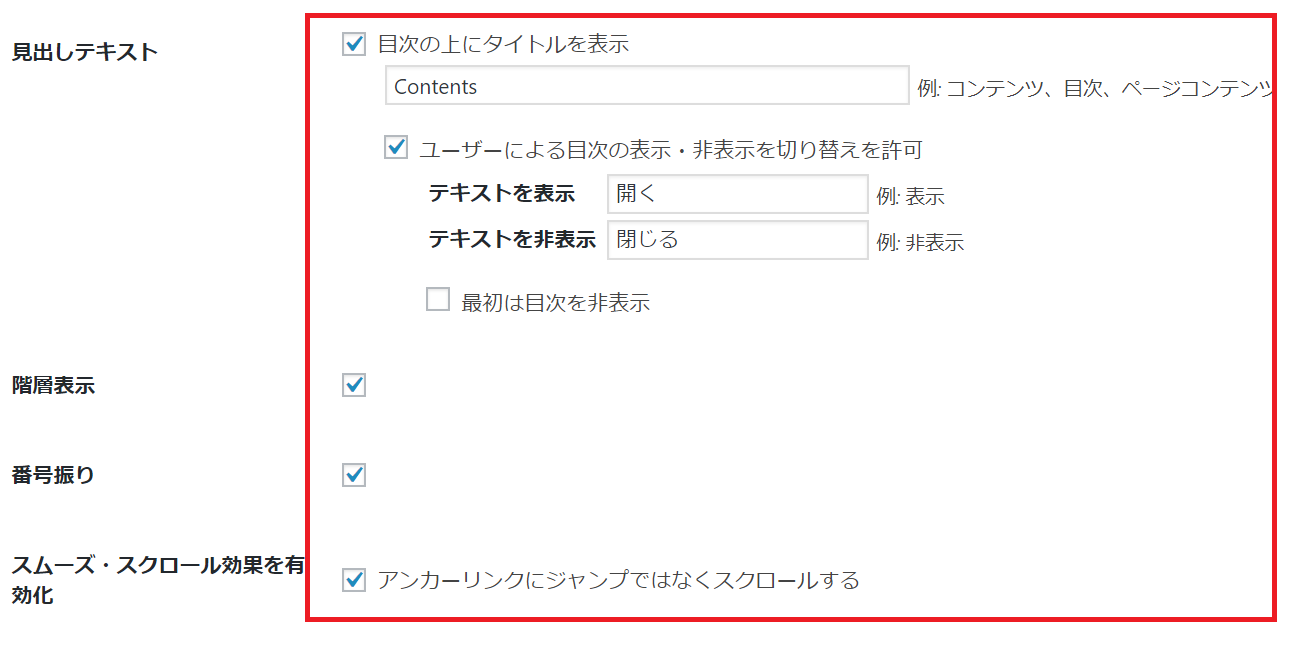・ユーザによる目次の表示・表示を切り替えを許可にチェック