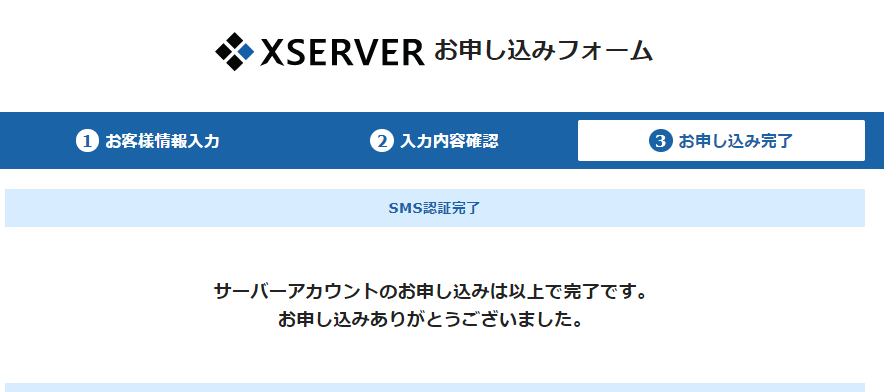 下記画面が表示されれば無事エックスサーバの申し込みが完了しました。