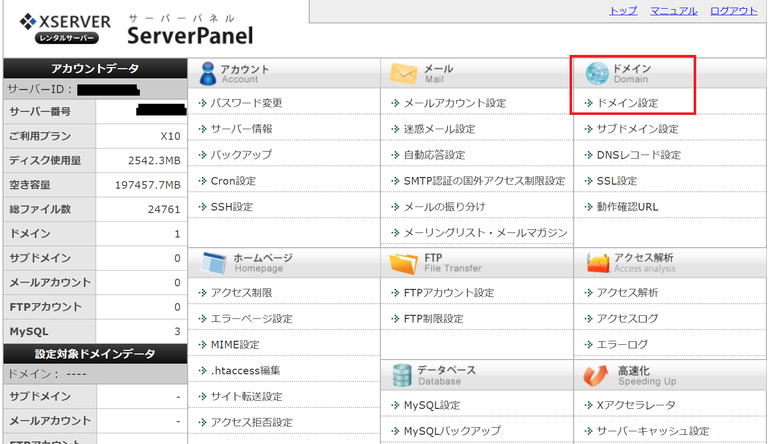 サーバーパネルにログインしたら、右側にある「ドメイン」から「ドメイン設定」を選択します。