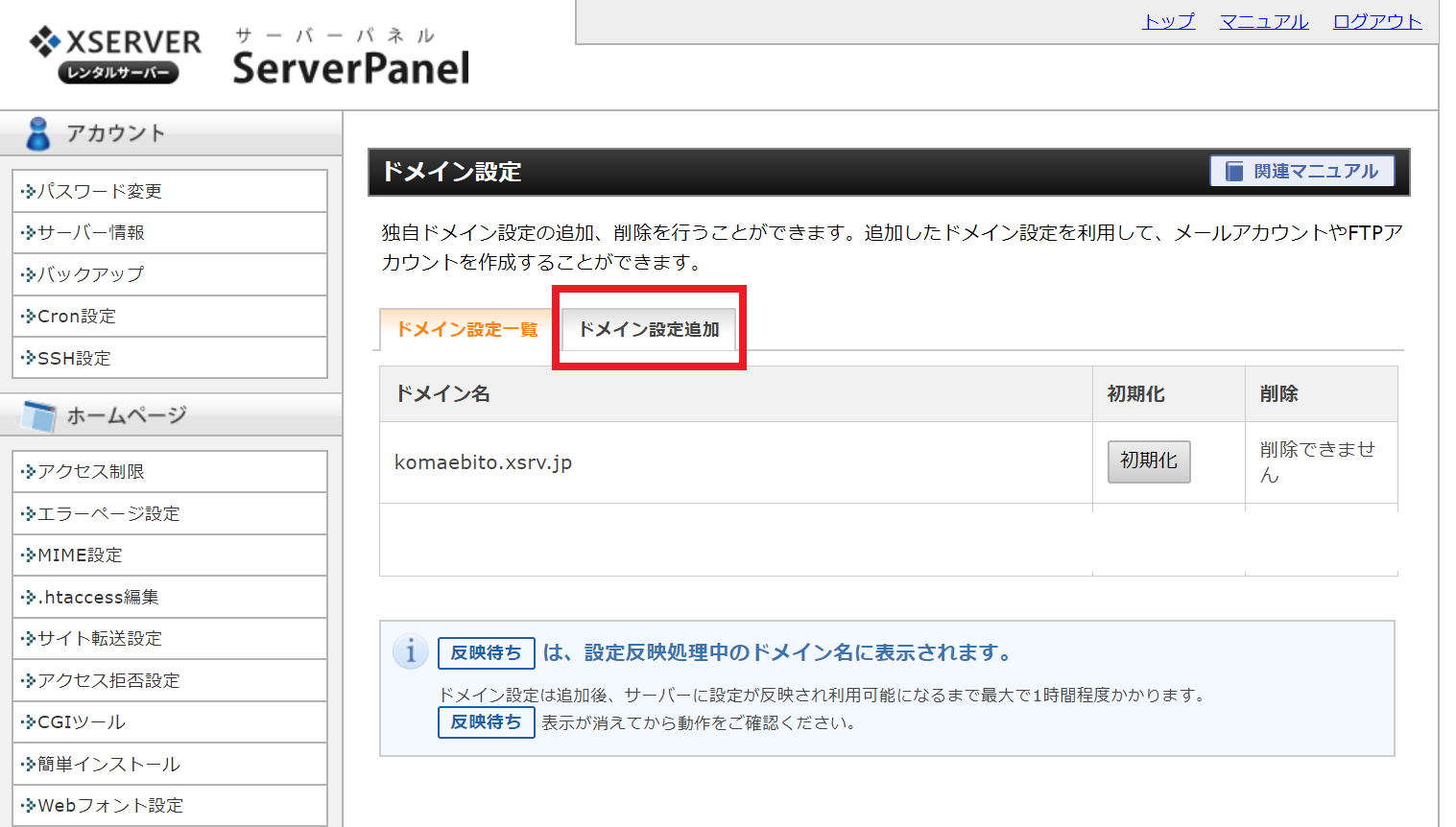 ドメイン設定という項目から、「ドメイン設定追加」というタブを選択します。