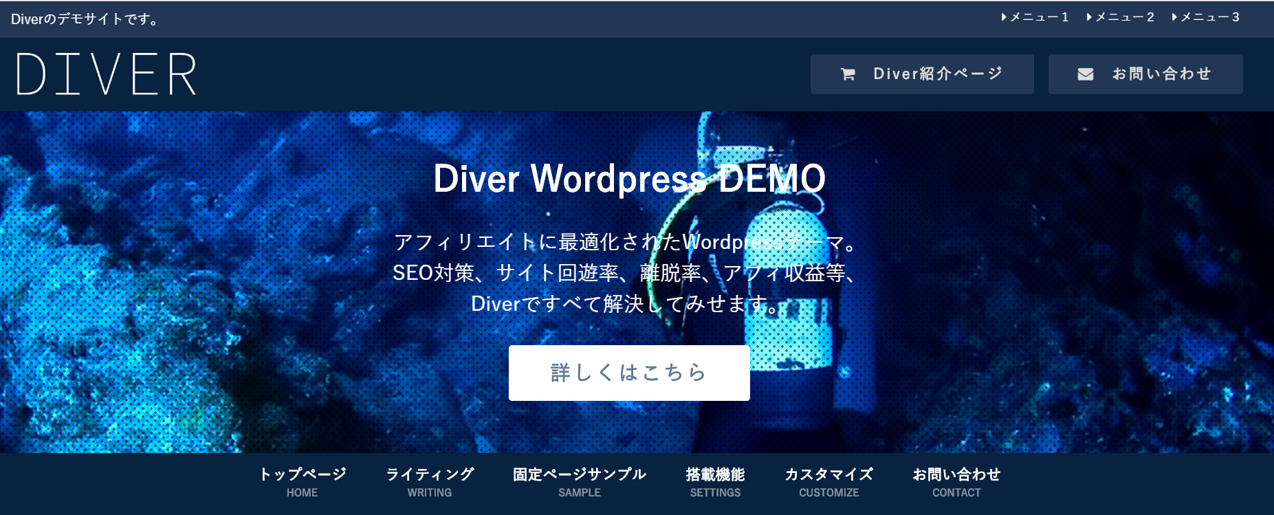 Diverは、初心者でも簡単に利用することが可能な高品質高機能なハイスペックワードプレステーマです。実際に、企業に納品してきたノウハウと技術をすべての人に利用可能なWordpressテーマとして最適化いたしました。知識だけで作られたテンプレートは山ほどありますが、実績に基づいて作られた内部構造や無駄の無い美しいデザインはとても洗練されています。また、私たちだけの実績知識だけでなく、Diverを利用していただいているすべての方の実績に基づくノウハウがすべて詰まっております。皆様で作り上げたWordpressテーマといっても過言ではありません。