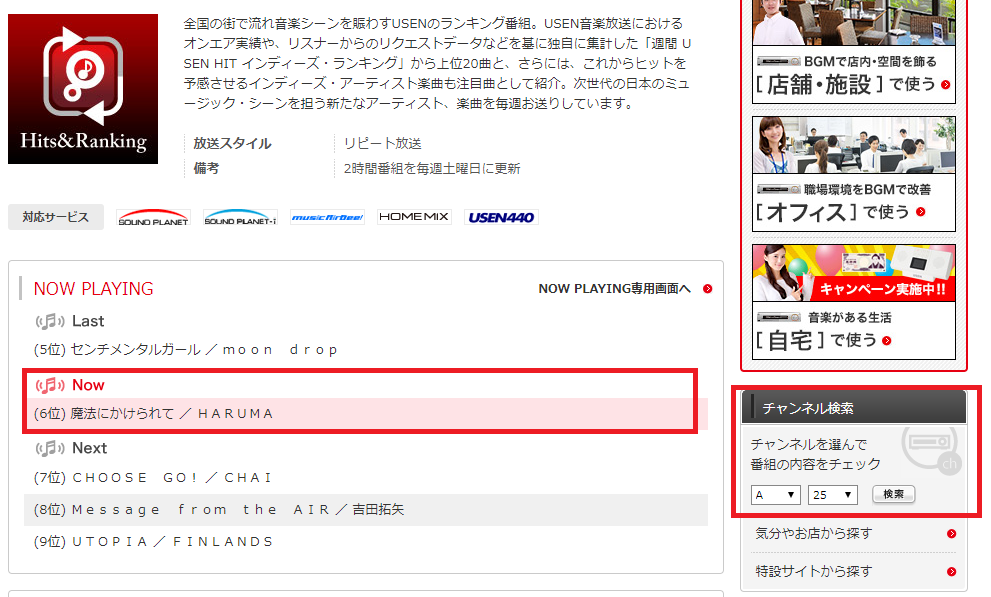 こちらのページから「チャンネル検索」よりチャンネルを選ぶと、「NOW PLAYING」となっている曲を探せば探せば、今流れている曲がわかります。