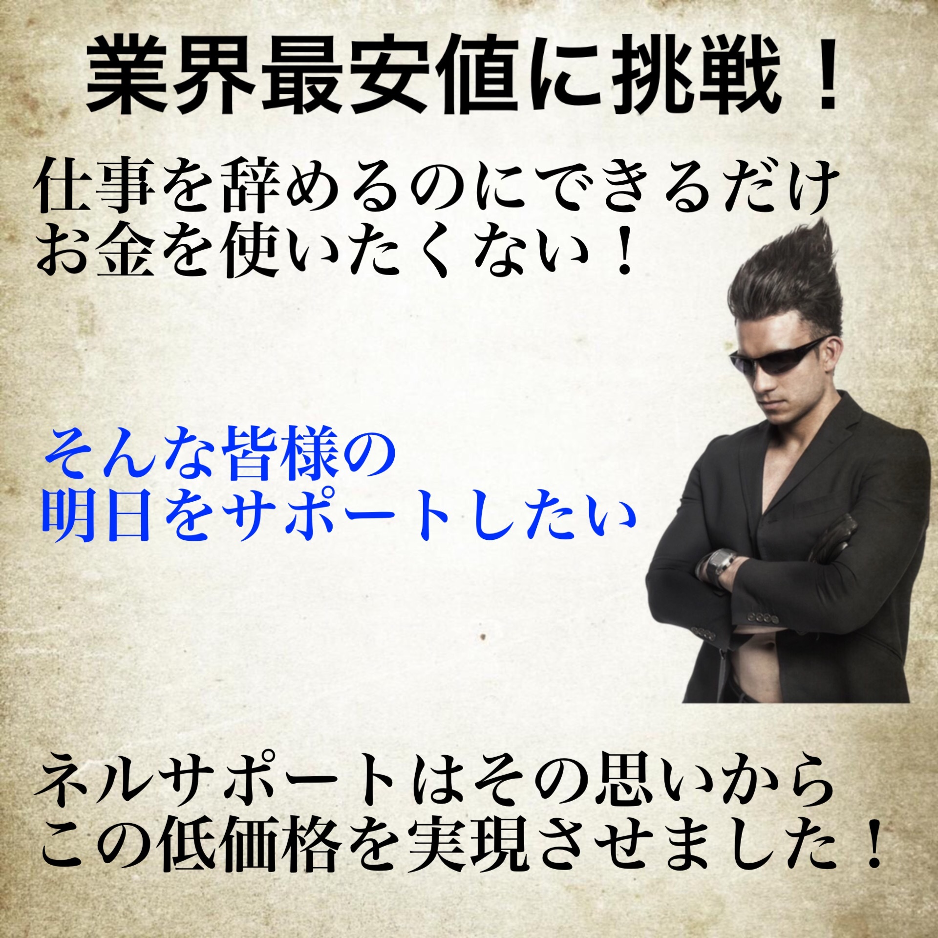 仕事を辞めるのにできるだけお金を使いたくない! そんな皆様の明日をサポートしたい! ネルサポートはその思いからこの低価格を実現させました! |